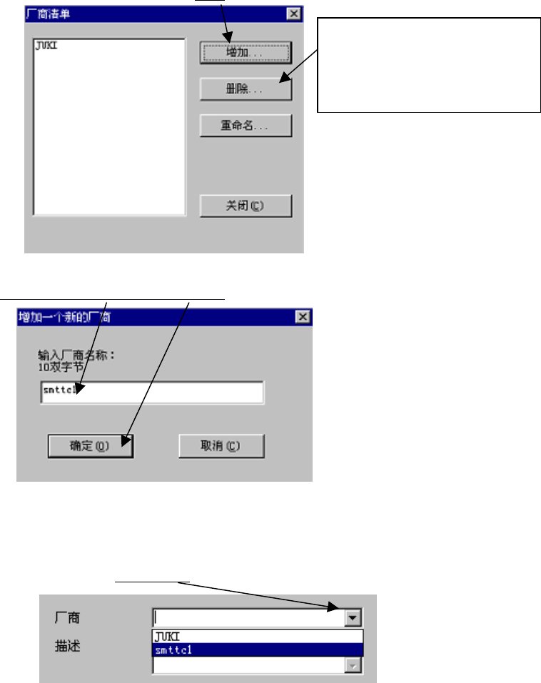 第 5 章 其它功能 Rev03 5-1-6-2 厂商 作为元件数据的参考项目,可以显示“厂商清单”。 “厂商清单”制成后,列在“元件表格”的厂商栏里,供选择。 1) 厂商清单的生成顺序 ①单击菜单栏上的「工具」/「厂商」。 ②显示厂商清单画面后,单击「 增加」。 要删除原有厂商名时, 先选择 厂商名,然后单击「删 除」即 可。 图 5-1- 6-17 ③输入新的厂商名后,单击「确定」。 图 5-1- 6-18 2) 选择厂商名 在元件…
