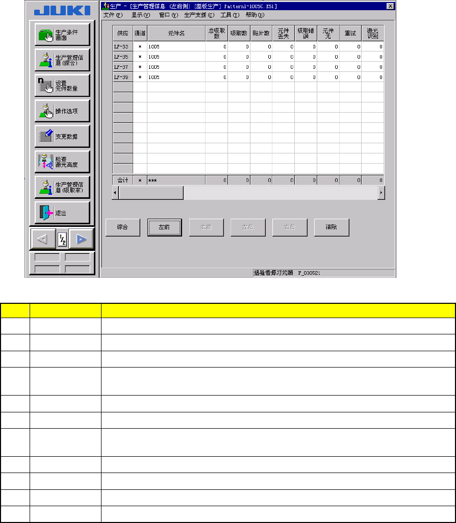 第2章 生产 Rev03 ③吸取率 显示“各供应设备的吸取率(吸取率 = 吸取数 / (吸取数 + 吸取错误数))”。 ◇ 画面通常从[吸取率最差]送料器开始排列。 (参见图 2.9.1.4) 图 2.9.1.4 吸取率显示画面(从最差者起排列示例) No. 项目 内容 1 供应 各供应位置。 2 通道 采用管状送料器时,为通道编号。 3 元件名 显示元件名。 4 总吸取次数(A) 吸取数 + 吸取错误数 5 吸取数(B) 吸取成功的元…
