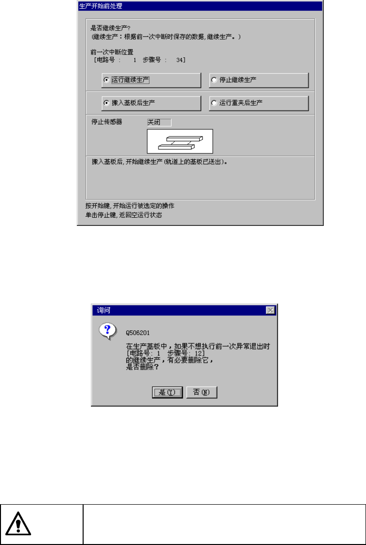 选择〈是〉:删除继续生产数据。选择后,不能继续进行该次异常停止前的生产。
