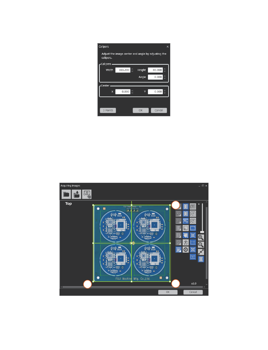3. Job 管理 OPE-NEXIM-007S0 88 Nexim 操作手册 4. 点击画面左上角的 [ 打开影像文件 ] 图标 (i),选 择需要读取的影像文件。画面内将 显示出电路板的影 像。 5. 如果读取的电路板图像不正,请调整图像的位置与角 度。请点击 [ 调整中心位置与角度 ](k)。显示出 Callipers Tool 的对话框。 6. 请利用以下任何一种方法将卡尺 (callipers object 绿色选框 ) 对准…