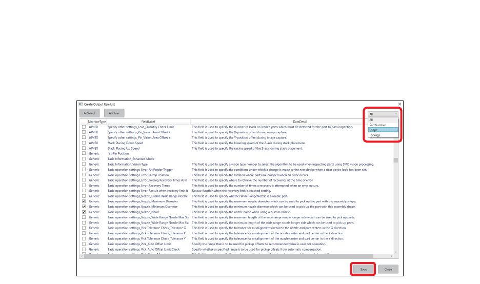 OPE-NEXIM-007S0 4. 元件数据的管理 Nexim 操作手册 145 4.1.8 导出和导入元件数据 CSV 文件 以 CSV 文件的形式输入元件库以及 Job 数据内的数据 (元件号码、外形、包装) 。另外,还可以对输出的 CSV 文件进行编辑并读入。 输出的项目的设定 使用 Create Output Item List,设定输出的项目 。 1. 请从 Windows 的开始菜单启动 [Create Outpu t I…
