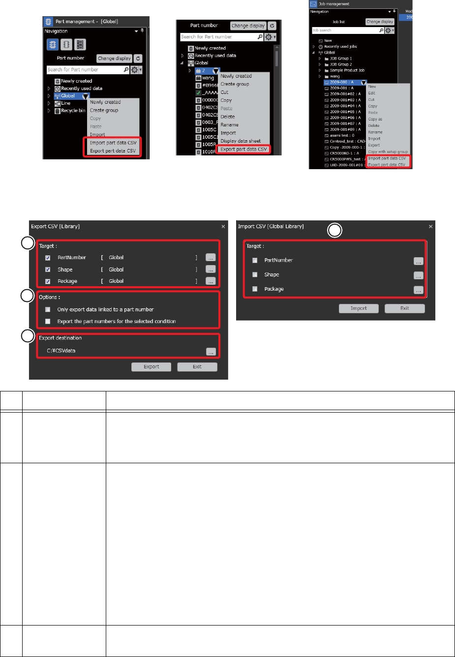 请先选择下列地点,然后再右击鼠标,最后再选中菜单中的 [Export part data CSV] 选项或 [Import part