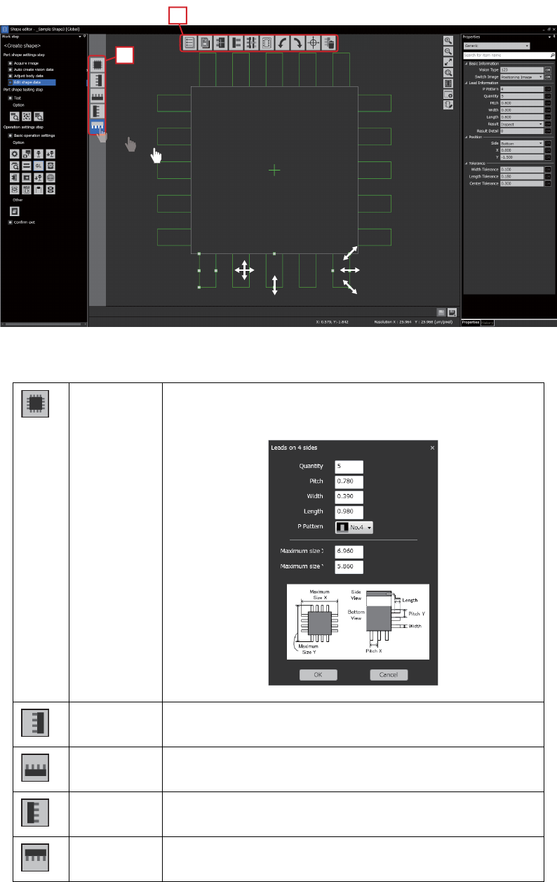 4. 元件数据的管理 OPE-NEXIM-007S0 166 Nexim 操作手册 元件主体数据的调整 以鼠标拖放的方式编辑元件主 体数据。 在属性区输入主体数据的数值。 形状数据的编辑 以鼠标拖放的方式创建与编辑 引脚与锡球的数据。 利用键盘上的 [Ctrl]+[ z] 键可以返回到操作前的状态。 在属性区输入各引脚以及锡球 数据的数值。 a 自动计算 进行自动计算处理。 b卡 尺 ( C a l i p e r s Tool) 进行…