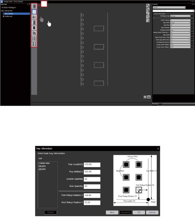 4. 元件数据的管理 OPE-NEXIM-007S0 182 Nexim 操作手册 4.4 封装的编辑 4.4.1 封装设置的步骤 基本设定 可以用鼠标拖放的方式编辑封 装数据。 在属性区输入个数据的数值。 a. 选择封装类型,然后以鼠标拖放的 方式进行设置。 请在 「tray informat ion setting」 对话框内创建料盘数据。请输入料盘信息。 41PRG-0033-Eb a. 41PRG-0216-Ea