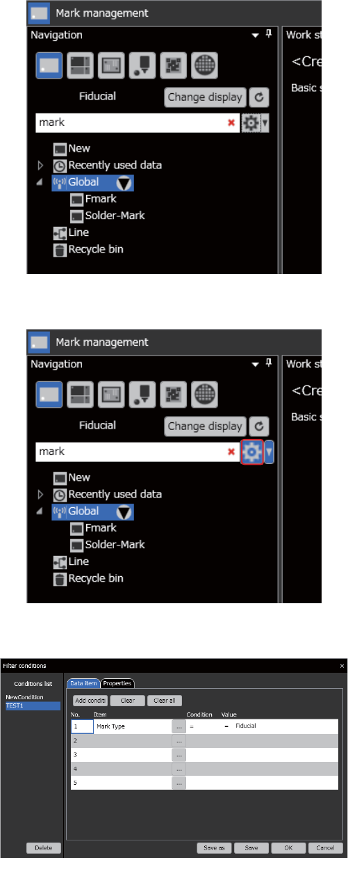 OPE-NEXIM-007S0 5. 定位点数据的管理 Nexim 操作手册 185 5. 定位点数据的管理 备注 如果在选中设定项目的同时按住 [F1] 键,浏览器就会自动启动。写有项目说明的帮助就会显示在画面上。请充分运用这项功能。 5.1 定位点数据的操作 5.1.1 定位点数据的搜索 不仅能搜索 Job 名,还可以设置搜索条件进行快速搜索 。 可以保存搜索条件。 定位点数据搜索方法 41PRG-0091-Ea 41PRG-021…