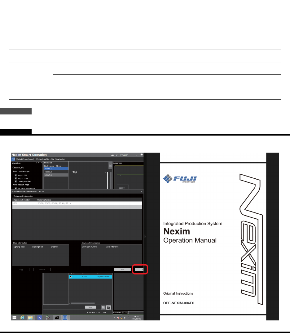1. Nexim 图表 OPE-NEXIM-007S0 4 Nexim 操作手册 1.2 Nexim 作业流程 本小节对于 Nexim 的作业流程进行说明。 No. Nexim 作业工序 作业内容 参考 1. 数据管理 数据管理主要包括以下事项 。 a. 创建 / 编辑 Job b. 创建 / 编辑元件数据 c. 创建 / 编辑定位点数据 2.2, 3., 4., 5. 2. 进度表 进度表主要包括以下事项。 a. 创建 / 编辑生产进…
