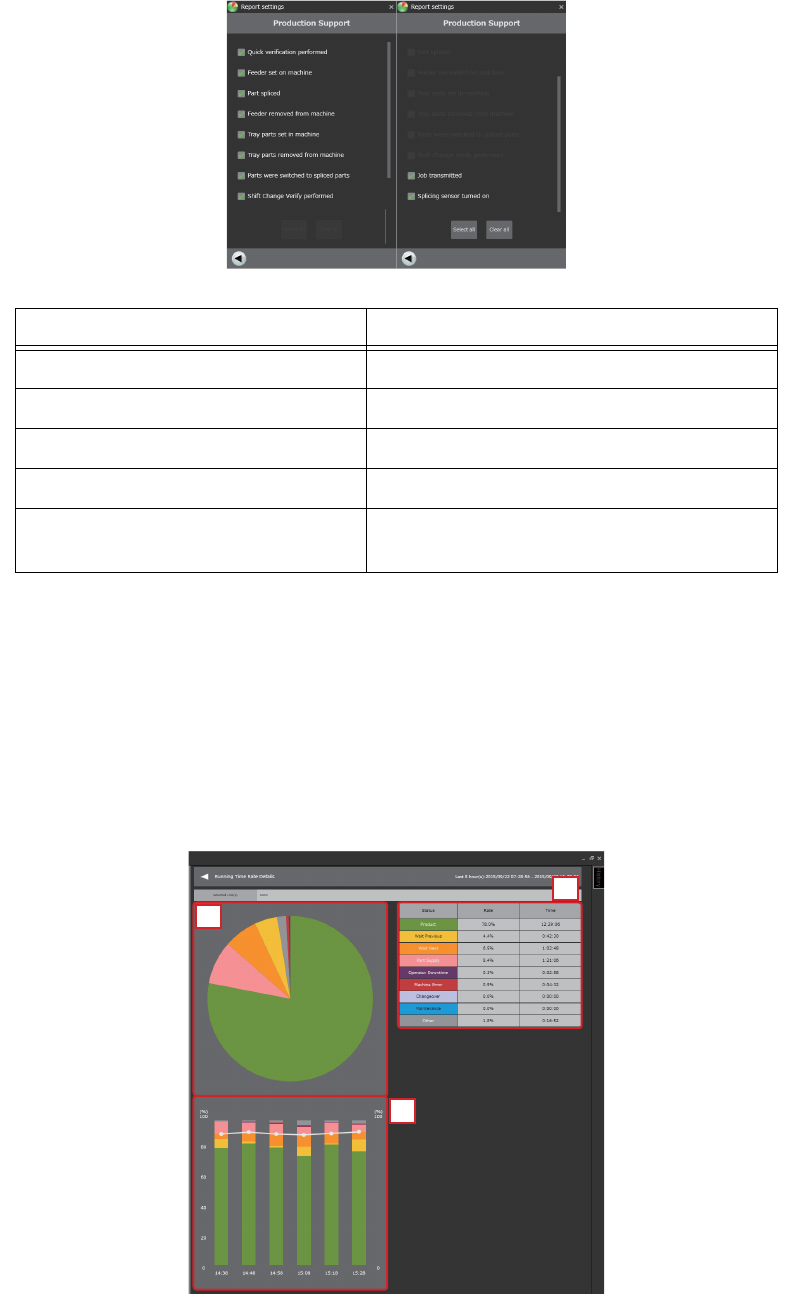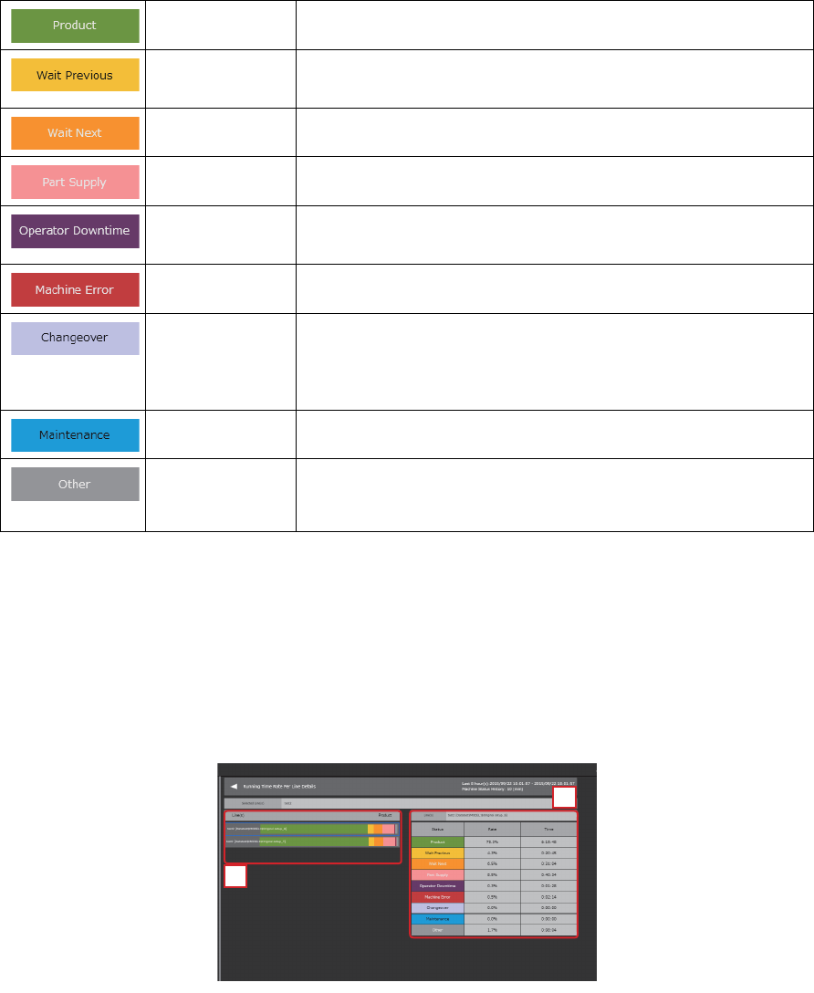 OPE-NEXIM-007S0 8. 进度 / 监控 / 分析 Nexim 操作手册 295 b. 显示选择的生产线或者模组所有对 象期间的以最近 10 分为单位的导出结果。 折线图显示 [CPH]、[ 生产完成块数 ]、[ 生产完成子电路板块数 ]、[Uptime] 中的某一个。 显示内容通过设定对话框的 [ 机器状态进展图表 ] - [ 折线图 ] 可以变更。 c. 关于机器状态表的说明。 • 机器状态 : 用彩色区别机器状态后显示…