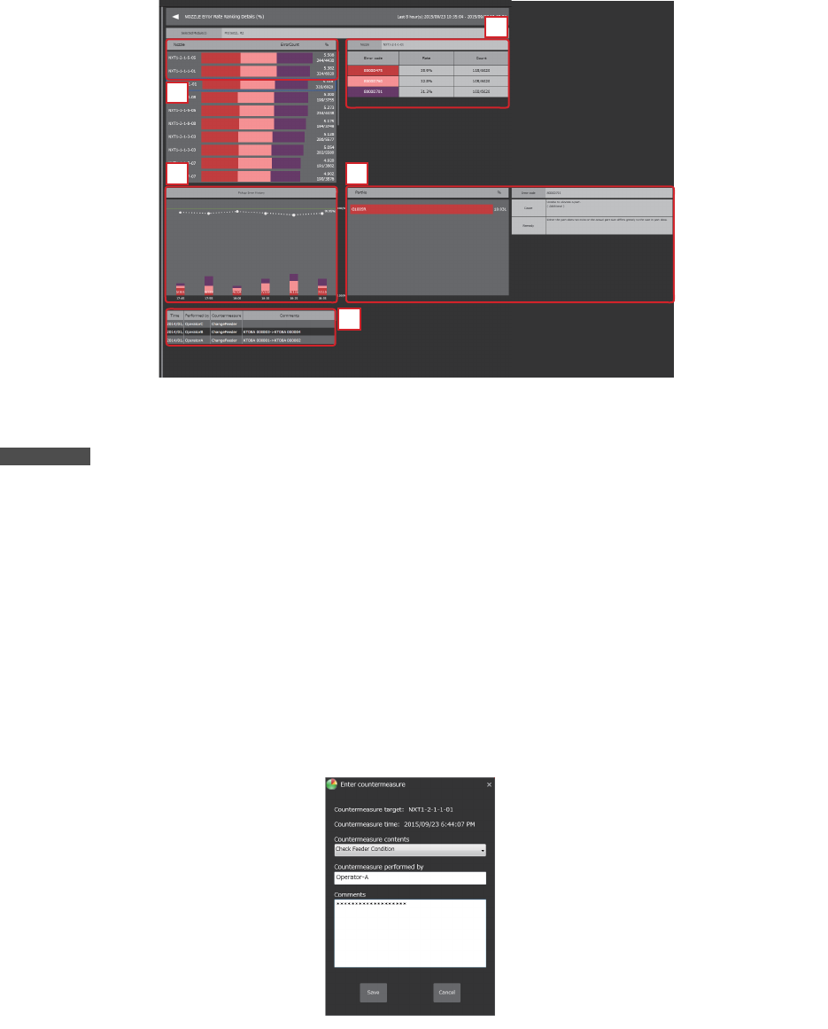 OPE-NEXIM-007S0 8. 进度 / 监控 / 分析 Nexim 操作手册 303 输入对策显示在 [e.] 上。 d. 显示在 [b.] 选择的错误编码的原因和对策。 e. 显示在 [c.] 输入的对策一览表。 项目 说明 对策输入对称 显示对称的料槽号码。 显示以 [ 机器别名 - 模组号码 - 平台号码 - 料槽号码 - 副料槽号码 ] 构成。 对策时间 显示输入时间。 对策内容 从下拉式菜单选择对策内容。 对策执行者 …