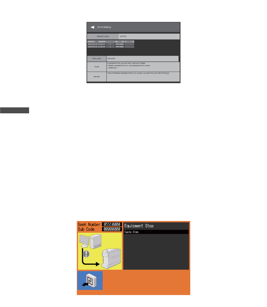 OPE-NEXIM-007S0 8. 进度 / 监控 / 分析 Nexim 操作手册 323 机器状态是 [Machine Error] 时的操作 1. 请点击 [Statu s] 下方的 [Machine Error] 键 。 点击之后, 错误履历就会显示在 Management monitor 的副画面上。请先确认错误, 然后再解除错误。 2. 请点击 [Operation] 下方的 [Start] 键。请解除可以恢复的错误并开始生…
