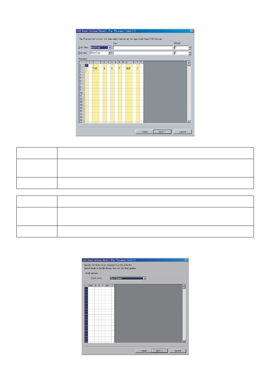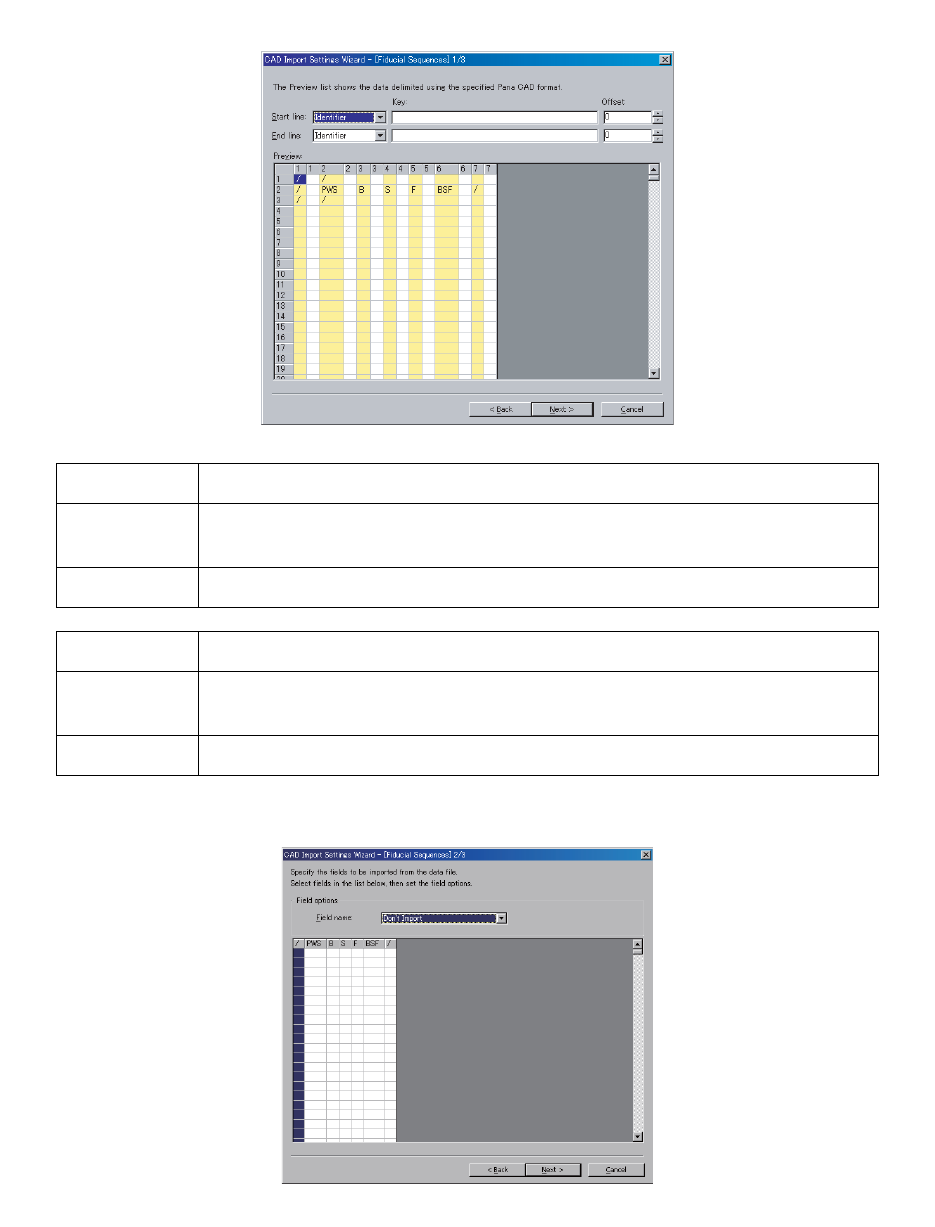 OPE-NEXIM-007S0 12. 读入 CAD 数据以及 BOM 数 据 Nexim 操作手册 409 6. 请在 [CAD Import Settings Wizard] 对话框上点击 [Next] 键。 (请参考步骤 1 .) 7. 为了读入元件的贴装坐标,请根据需求设置如下。设 置完毕后,请点击 [Next] 键。 8. 请选择被划分的各个领域 (field)并在 [Field name] 项目后面的下拉菜单中进行选择。 9…