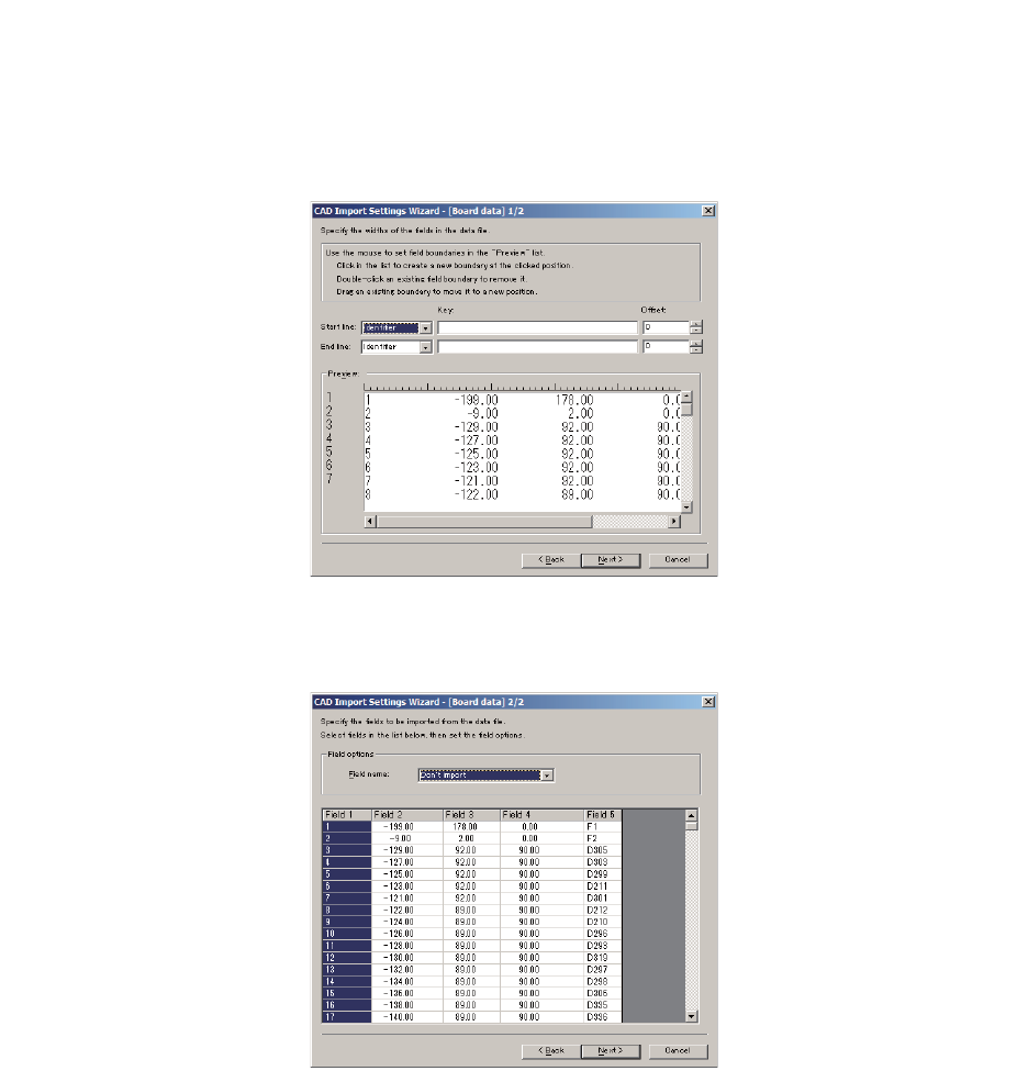 a. 请指定 board data 的起始行和结束行。指定方法和 [CAD Import Settings Wizard - [Part