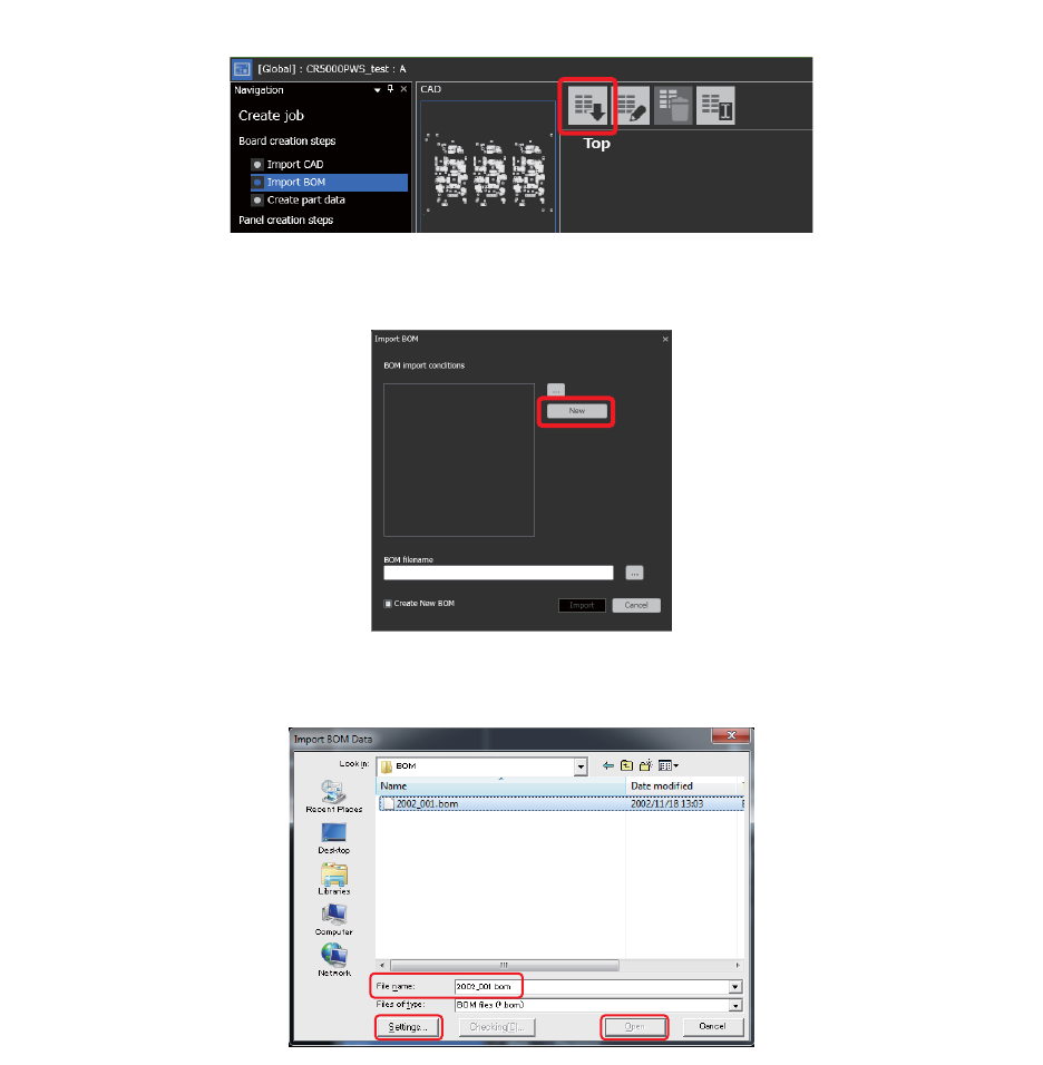 12. 读入 CAD 数据以及 BOM 数据 OPE-NEXIM-007S0 422 Nexim 操作手册 4. 画面上弹出 [BOM Import Settings] 对话框。请对各个项目进行设置。 BOM 导入设定文件事先已准备完毕的情形 a. 则请点击 [read...] 键。画面上弹出 [Open] 对话框。请先选中 BOM 导入 设定文件,然后再点击 [Open] 键。被选中的文件的设定内容会显示在 [BOM Import S…