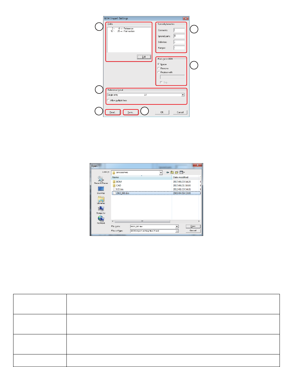 [Open] 键。被选中的文件的设定内容会显示在 [BOM Import Settings] 对话框内。