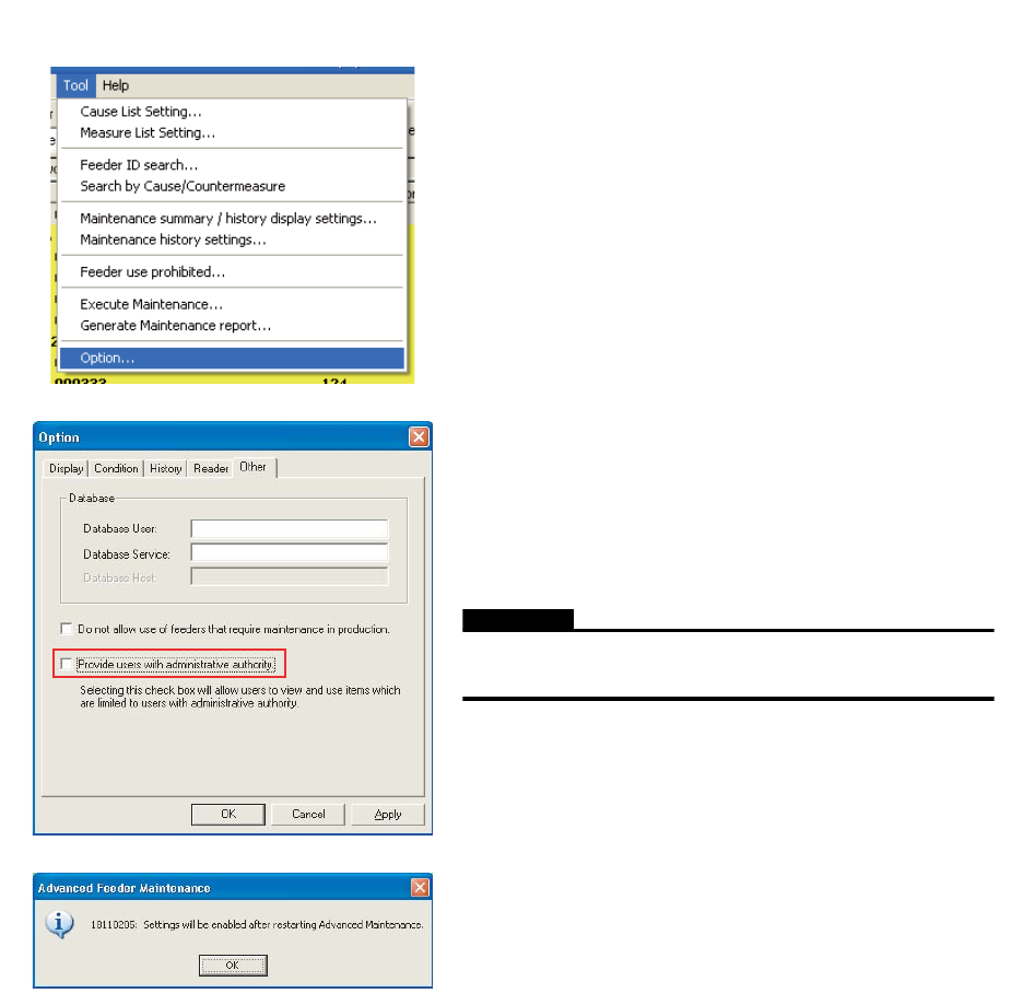 OPE-NEXIM-007S0 13. A dvanced Feeder Maintenance Nexim 操作手册 435 更改设置以确保只有管理员才可对维修保养警告条件及公差值设置进行 更改 可以应用保护特征来确保只有 管理员才可以对维修保养警告条件和 阈值设置进行更改,说明如下。 1. 请 用 「Fujiadmin」进 行登录。 当前只有管理员才能执行的功 能如下所述。 • 设定 • 将保养预警计数清零 如果勾选 [ 向用户权限…