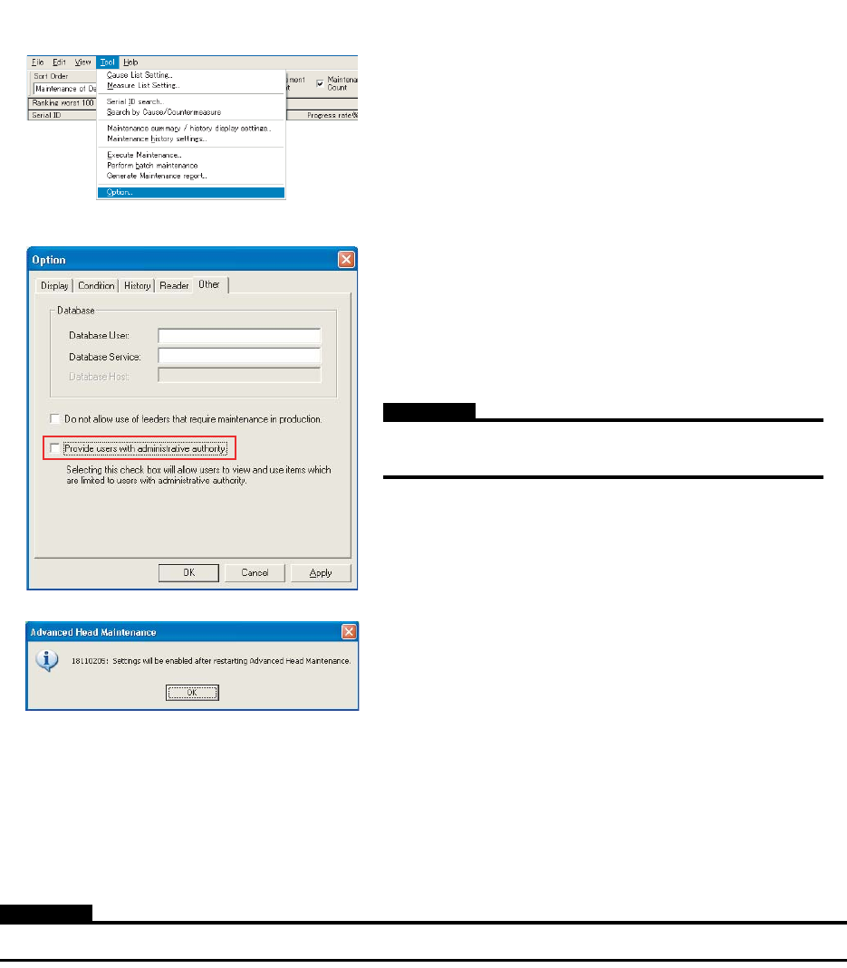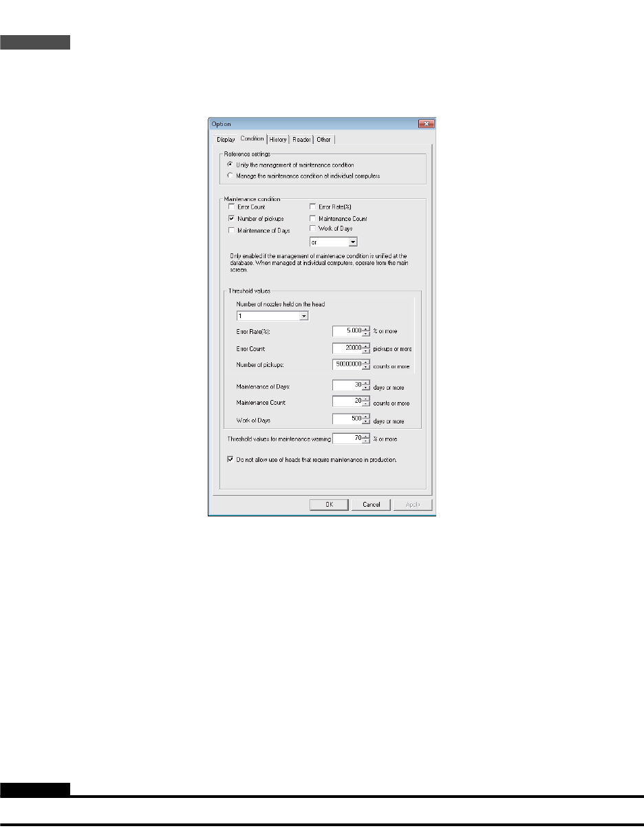 OPE-NEXIM-007S0 14. Advanced Head Maintenance Nexim 操作手册 481 处于需保养状态的器材序列号 ID 显示为红色。 1. 请 用 「Fujiadmin」进 行登录。 备注 在给予用户管理者权限时,不需要用 「Fujiadmin」进行登录。 2. 从菜单栏中选择 [Tool]-[Option],然后在弹出的 [Option] 对话框中选择 [Condition] 标签页。 a. [Re…