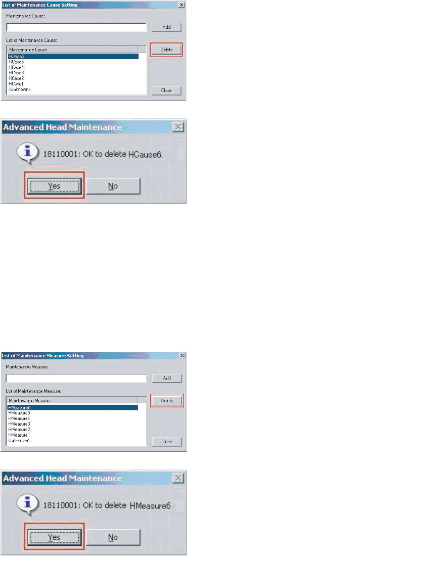 OPE-NEXIM-007S0 14. Advanced Head Maintenance Nexim 操作手册 509 14.7.9 从列表中删除工作头维修保养原因 本小节主要说明如何将已登录 的 「保养原因」从一览表内删除。 即使从列表中删除了原因,也 不会影响到某些使用所删除原因的维 修保养履历记录,初始原因是被保留下 来的。 14.7.10 从列表中删除工作头维修保养对策 本小节主要说明如何将已登录 的 「保养对策」从一览表内删…