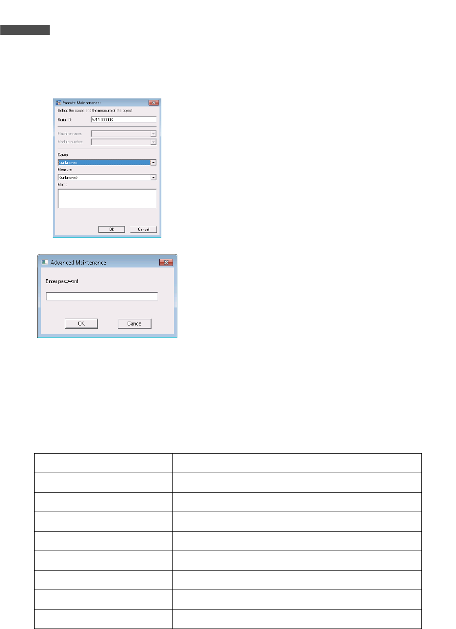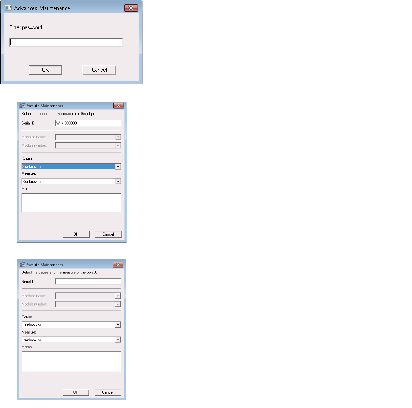 15. Advanced Nozzle Maintenance OPE-NEXIM-007S0 568 Nexim 操作手册 Entry mode( 接受模式 ) 旁边有勾选时的操作 1. 密码确认 点击画面右侧的 [Maintenance] 按钮,画面上就会自 动弹出密码输入对话框。 请输入密码并点击 [OK] 键。显示实施维修保养画面。 ( 密码不正确时,显示错误信息、不 显示实施维修保养 画面。) 2. 输入保养信息 请输入保养信…