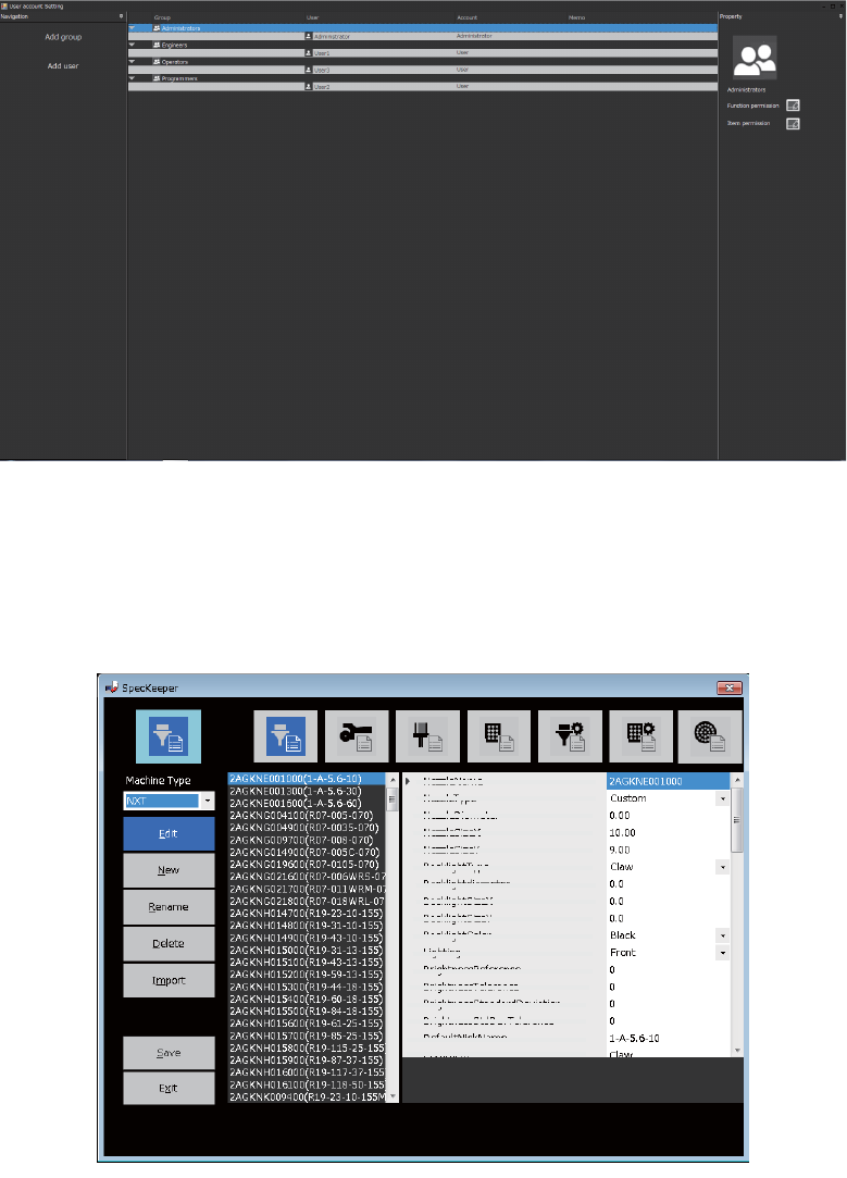 OPE-NEXIM-007S0 2. Smart Operation Nexim 操作手册 53 2.7.2 帐号设置 创建 / 管理用户的账号。 可以以群组为单位管理管理用 户账号。 每个用户可以设置专用的登录 密码。 2.7.3 Speckeeper 用于新建吸嘴、吸嘴置放台、供料器 等器材的规格数据或对现有数据进行 修改。 41PRG-0351-E 41OPE-1354-a