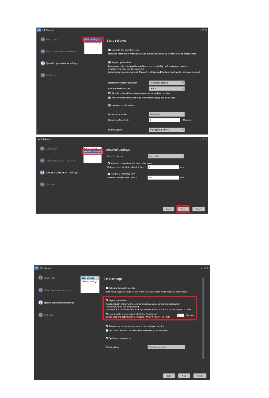 3. Job 管理 OPE-NEXIM-007S0 66 Nexim 操作手册 3. 请对与优化有关的 「Basic se ttings」 、 「Detailed set tings」 进行设置。设置完 毕后请点击 [Next] 键。 如果希望通过自动变更条件的方式 算出理想的周期时间,则请勾选 [Repeat optimization (反复 优化) ] 项目并向 [When optimization is not improved …