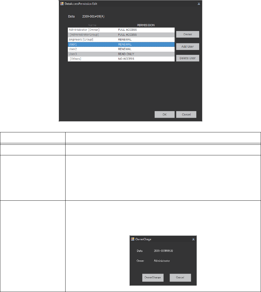 3. Job 管理 OPE-NEXIM-007S0 70 Nexim 操作手册 用户种类和访问权限与可操作 的关系如下所示。 追加用户 追加设定访问权限的群组 及用户。请选择对象的群组或者用户和访问 权限 的种类,单击 [OK]。 备注 在此显示的用户名是在 Nexim[ 帐号设定 ] 中设定的用户。 用户的删除 删除选择的用户。 用户 访问权限 读取 更新 删除 访问权限 的变更 所有者的 获取 Job 的传 送 所有者 NO ACC…