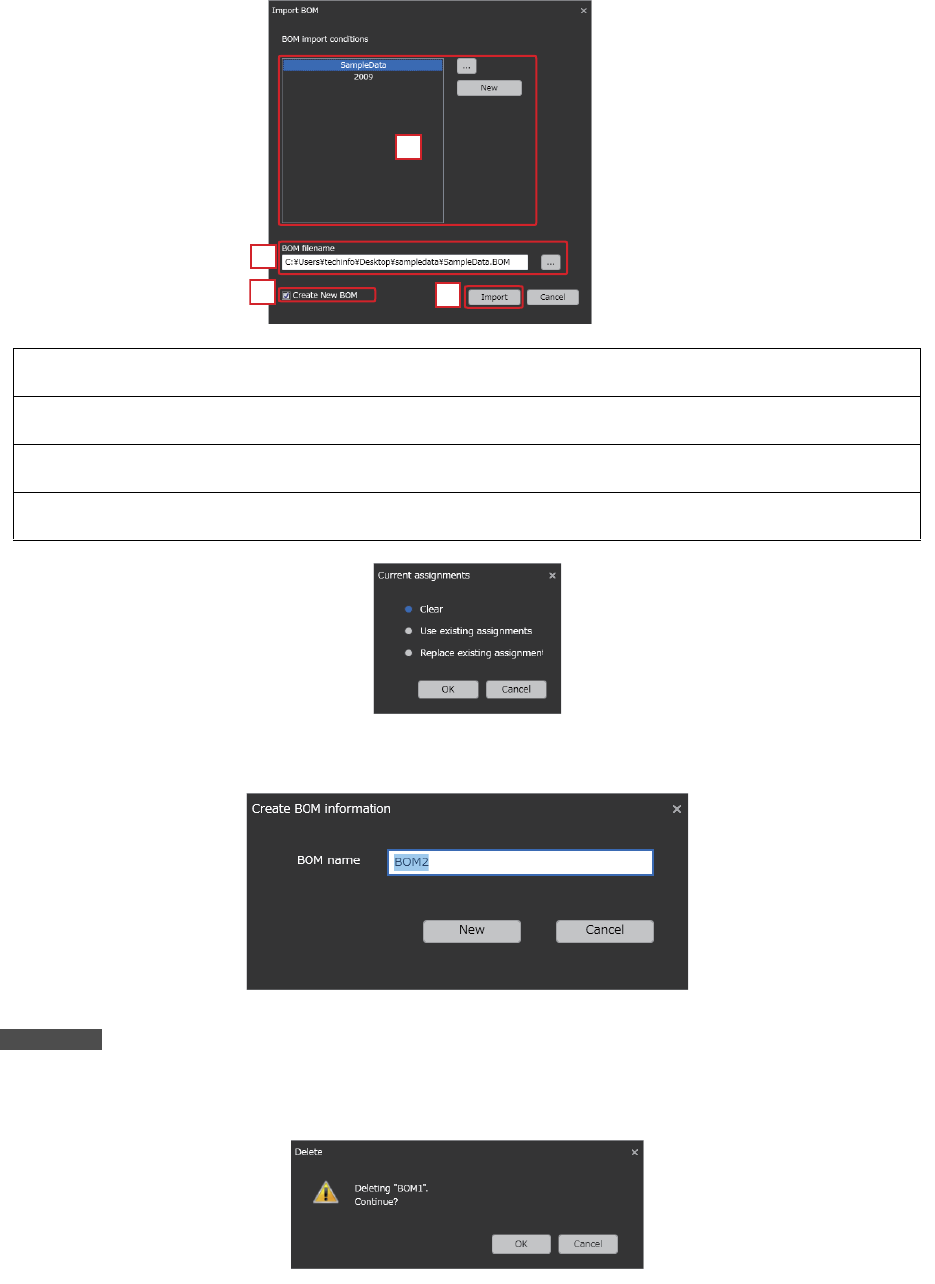 OPE-NEXIM-007S0 3. Job 管理 Nexim 操作手册 73 3.2.2 导入 BOM 数据 读取 BOM 数据。导入 CAD 数据。没有导入数据时还可以手动创建。 1 个 CAD 数据内可以创建多个不同 BOM。 创建的 BOM 显示在操作区的左侧。选择该 BOM 时可以在操作区内 确认电路板图像。 备注 不同的 BOM 指家族板 ( 出口不同地域的电路板 ) 的 BOM。 读取 BOM 操作方法 对于读取 BOM …