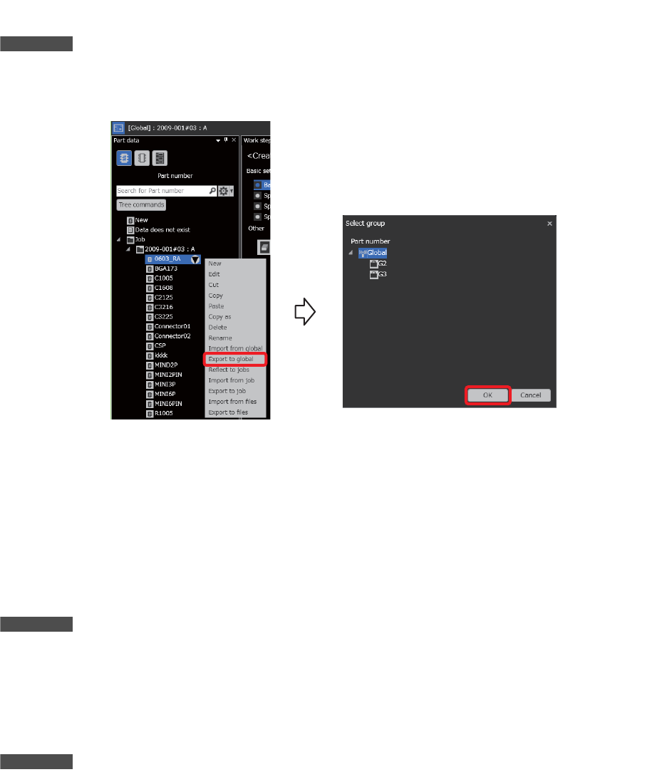 3. Job 管理 OPE-NEXIM-007S0 80 Nexim 操作手册 4. 导入元件号码时会弹出 “ 是否也导入外形和包装 ” 的确认对话框。 另外, 如果 Job 内的现有数据与将 要导入 Job 的数据同名,画面上会自动弹出 “ 是否用被选数据置换现有数据 ” 的确认对话框。请点 击对象选项。 Export to Job 1. 请先选中想要用于导出的 Job 内的数据并右击,然后再点击 [Export to Job]。数据…