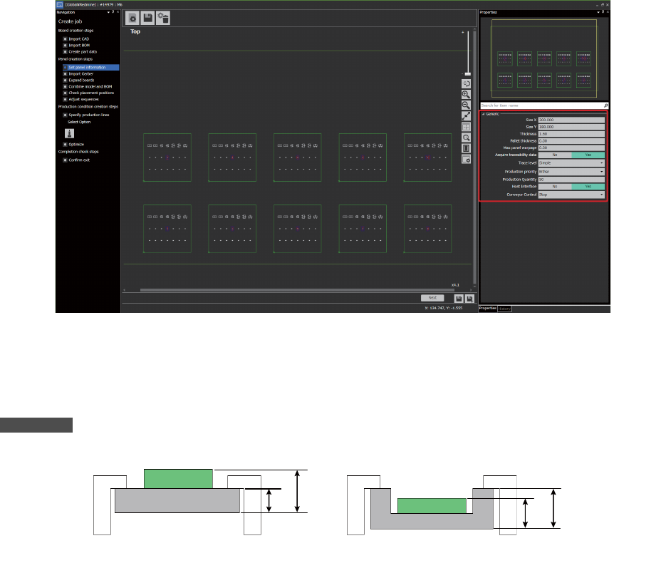 用托架运板时,请将搬运托架的厚度输入 [Pallet Thickness] 文本框内。关于 [Thickness] 和 [Pallet