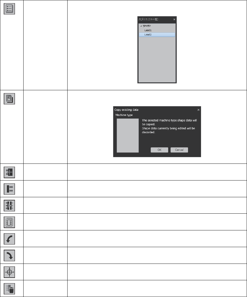 OPE-NEXIM-007S0 4. 元件数据的管理 Nexim 操作手册 169 创建锡球数据 a. 关于 [a.] 的图标说明。 追加规则排 列的锡球 追加横竖都整齐排列的锡球。在属 性区内输入锡球信息。请在属性 区输入引脚信息。 追加不规则 排列的锡球 ( 左下脚空 缺) 追加横竖都整齐排列的锡球。请在 锡球设置的对话框内输入锡球的 信息。 追加不规则 排列的锡球 ( 右下角空 缺) 追加右下脚空缺的错位排列的锡球 。请在锡球设置…