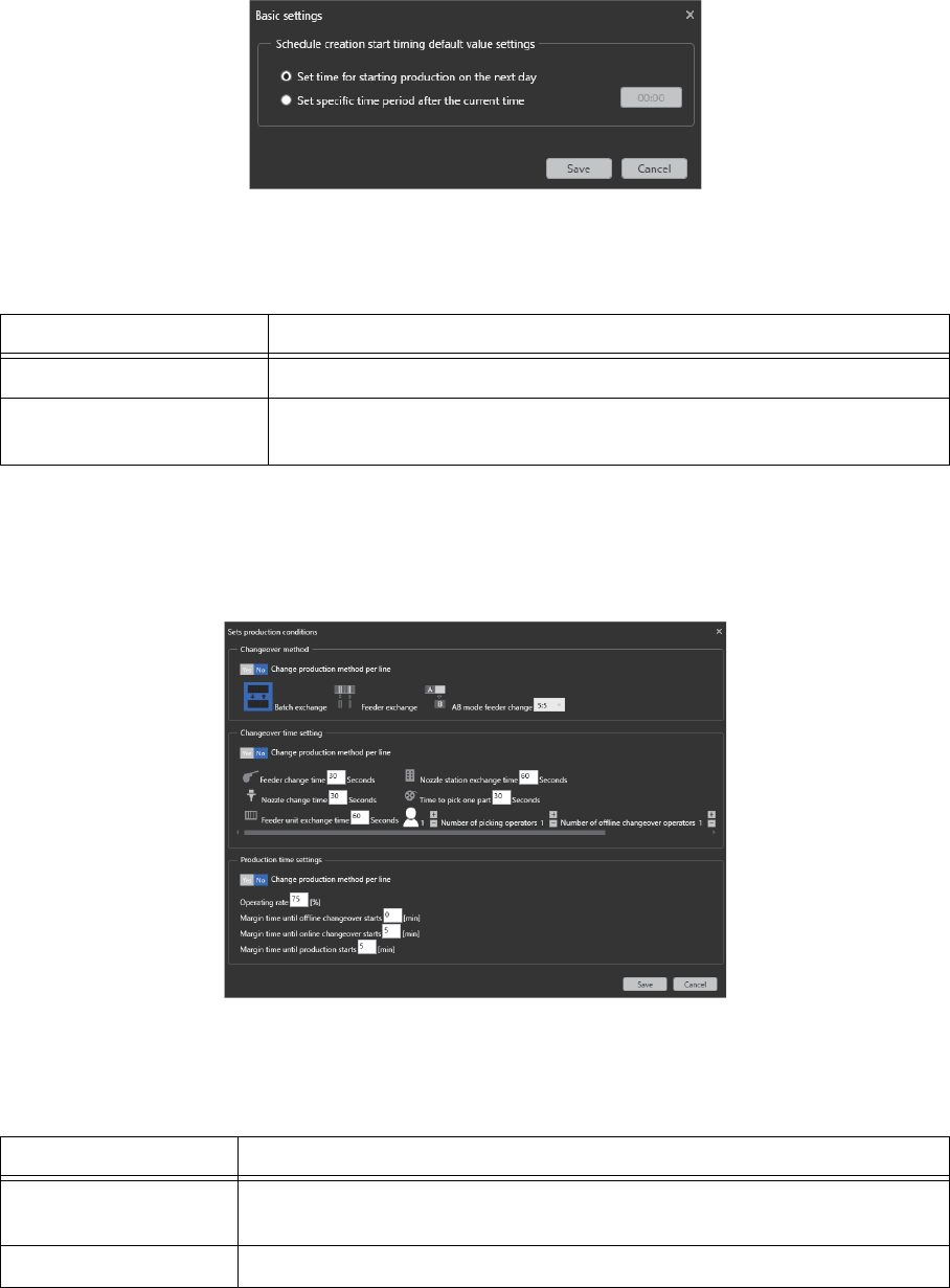 单击 [ 生产条件 ] 的话,显示出 [ 生产条件 ] 对话框。请进行换线方法、换线时间等的设定。把在此设定的