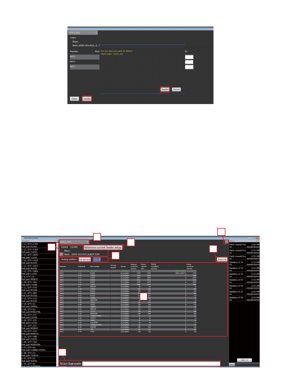 7. 运用 OPE-NEXIM-007S0 238 Nexim 操作手册 3. 单击 [ 删除 ] 按键显示出删除确认的对话框。 单击 [ 登录 ] 按键的话删除备料清单。 单击 [ 保存 ] 按键保存备 料清单。 7.2 备料 7.2.1 备料操作 从仓库提取元件。 利用对象 Job 与 Setup 创建的工单或者在根据进度表内 已创建的工单进行备料清单的创建。 由于备料清单可以根据保管场 所等进行分类,所以可简化备料作业。也可 以通…