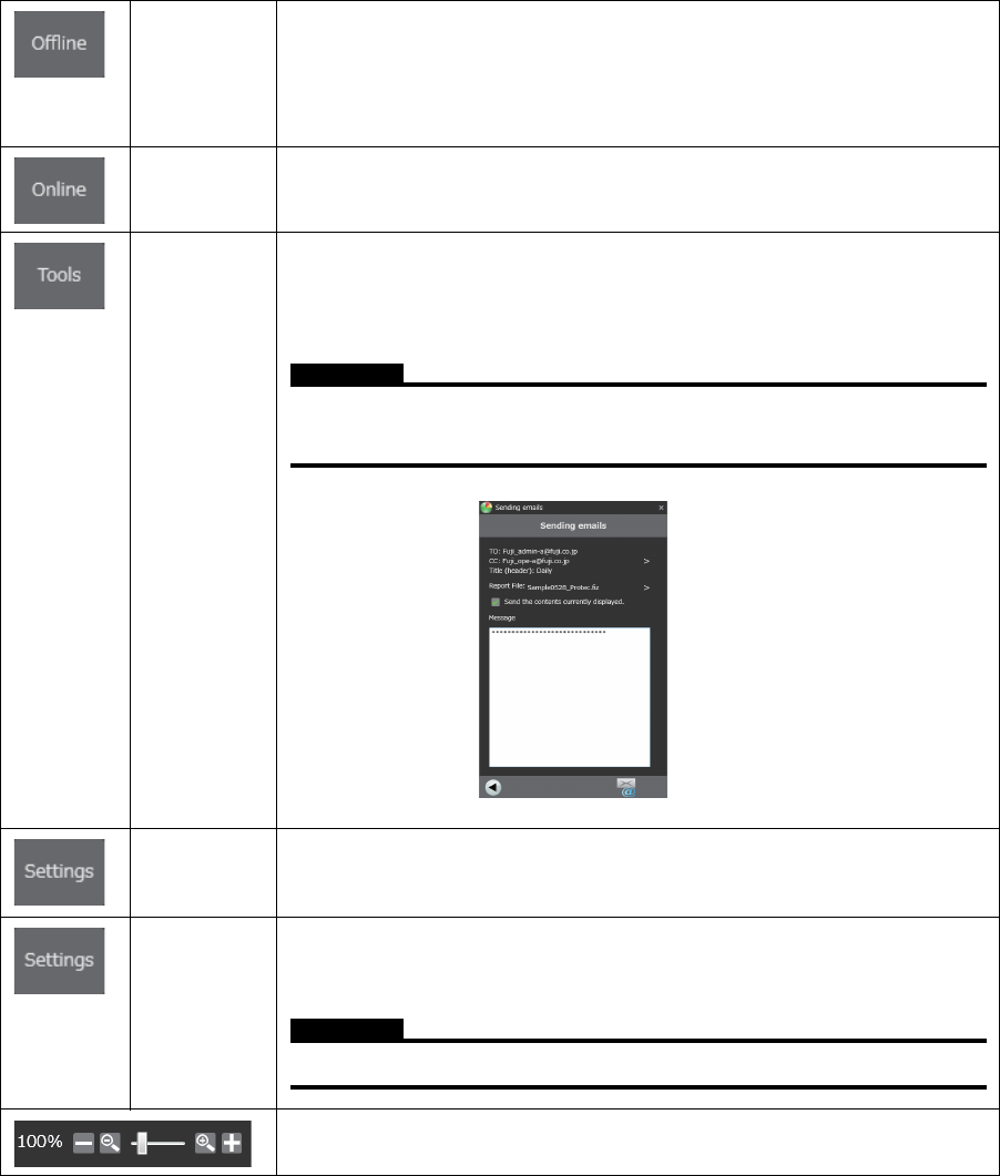 8. 进度 / 监控 / 分析 OPE-NEXIM-007S0 266 Nexim 操作手册 离线 变更为离线模式。 因为在线模式时常进行统计,所 以在分析中指标发生变化。分 析到当前 为止的统计数据时,如果变更为 离线模式,则可以在指标没有变化的 状 态下进行分析。 在线 变更为在线模式。 工具 在 Tool 对话框进行邮件发送、汇集结果的导入、导出。 在发送邮件的时候,可以添加输 出的导出报告或者当前的导出报告送 信。 注意 • 在…