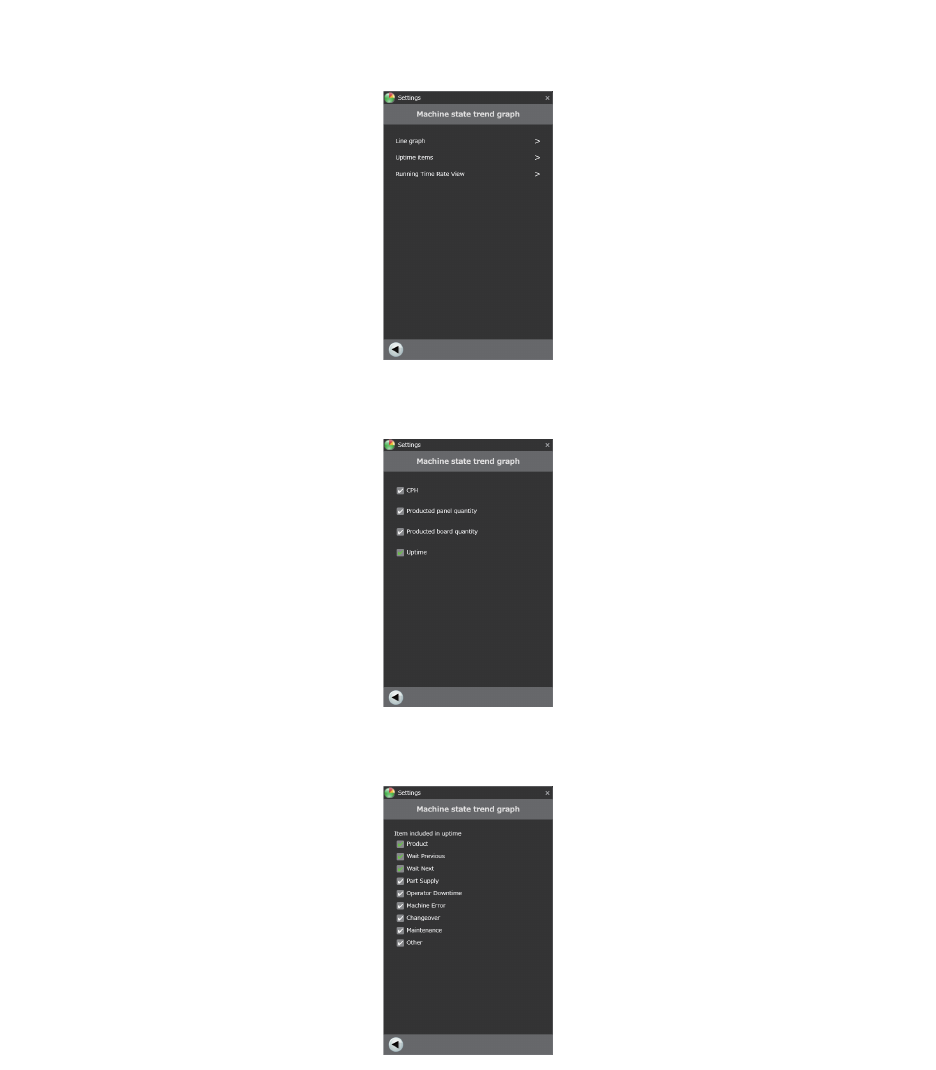 OPE-NEXIM-007S0 8. 进度 / 监控 / 分析 Nexim 操作手册 291 20. 机器状态推移图 进行副画面 [ 机器状态 ] 图表的显示设定。 • 折线图 : 在 [ 机器状态 ] 图表的折线图上显示什么时 请选择图表种类。 • Uptime 的项目 : 选择了折线图 [Uptime] 时,请选择包含在 Uptime 中的项目。 • 运转时间比例的显示 : 请选择在副画面的图表一览 表上显示的 [ 机器状态 ] 图…