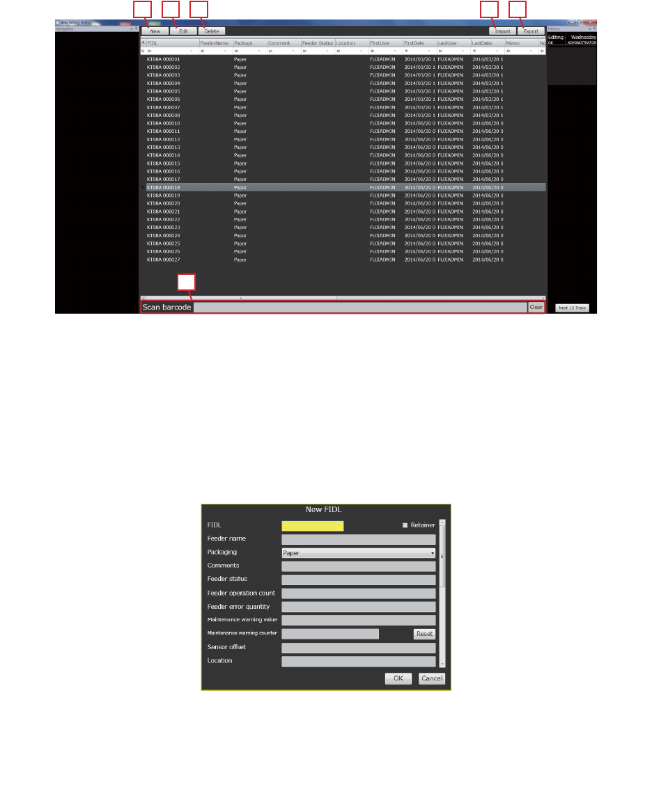 2. 点击 [New] 按键,显示出 「FIDL registration」对话框。使用手持式扫描器读取登录供料器的条形