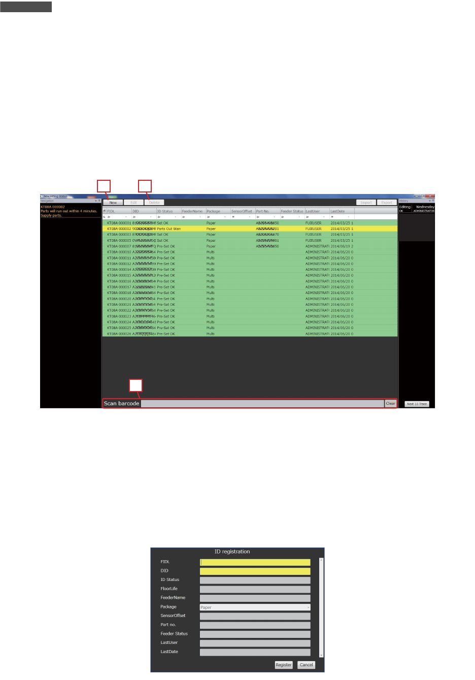 1. 适用手持式扫描器读取登录的料卷 / 料盘的 DID 或者供料器的 FIDL。显示 「IDregistration」对话