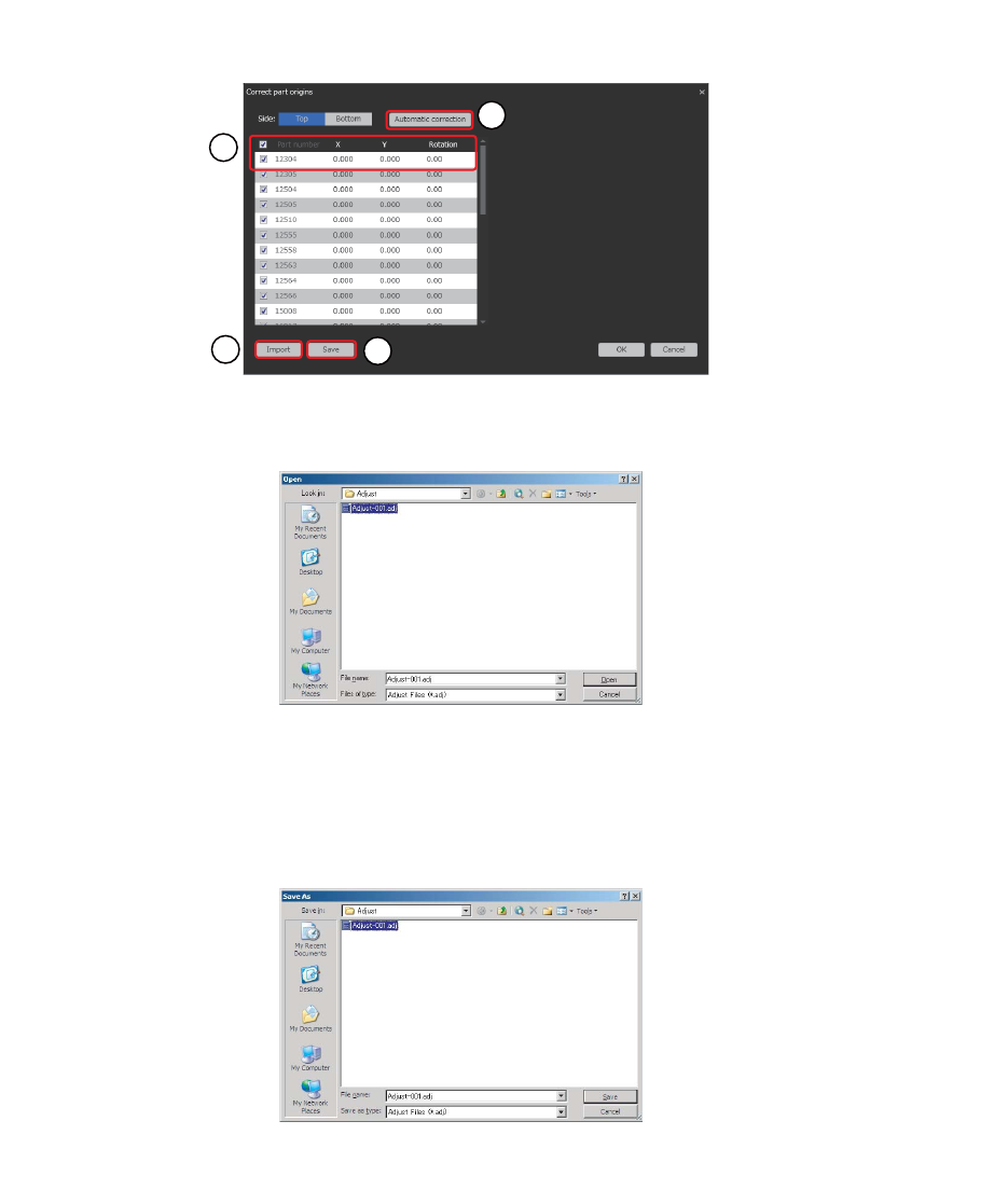 12. 读入 CAD 数据以及 BOM 数据 OPE-NEXIM-007S0 404 Nexim 操作手册 6. 画面上弹出 [Correct part origi ns] 对话框。 如果有需要, 则请对元件的基准点、 角 度进行变更。 如果 无需变更,则请直接跳至步骤 7.。 a. 如需读入补正值文件,则请点击 [Import] 键。画面上弹出 [Open] 对话框。请先选中补正值 文件, 然后再点击 [Open] 键。被读入的补正值…