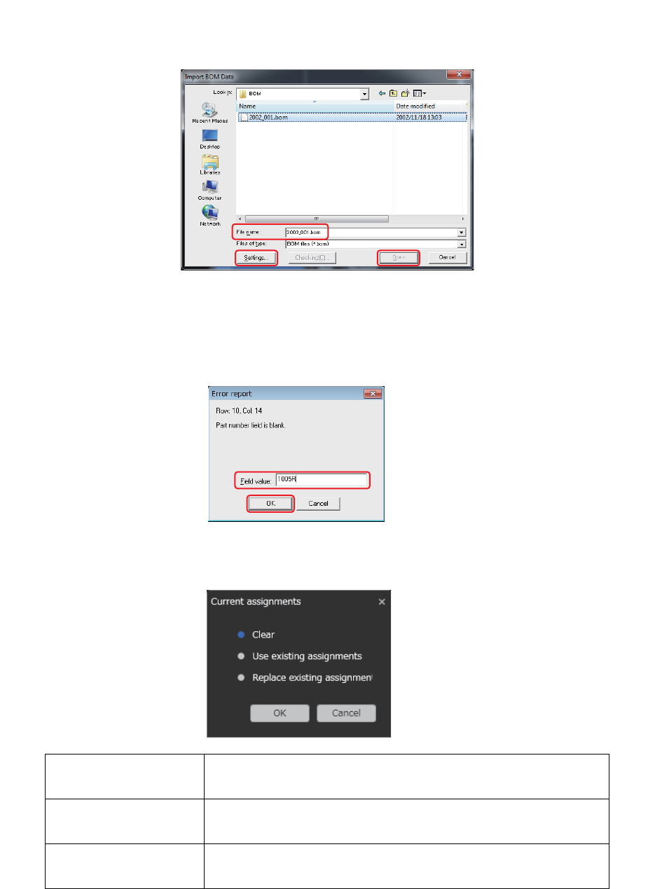 8. 画面上弹出 [Current assignments]对话框。请先选择针对现有 Job 的设定数据的 BOM 数据的取入方