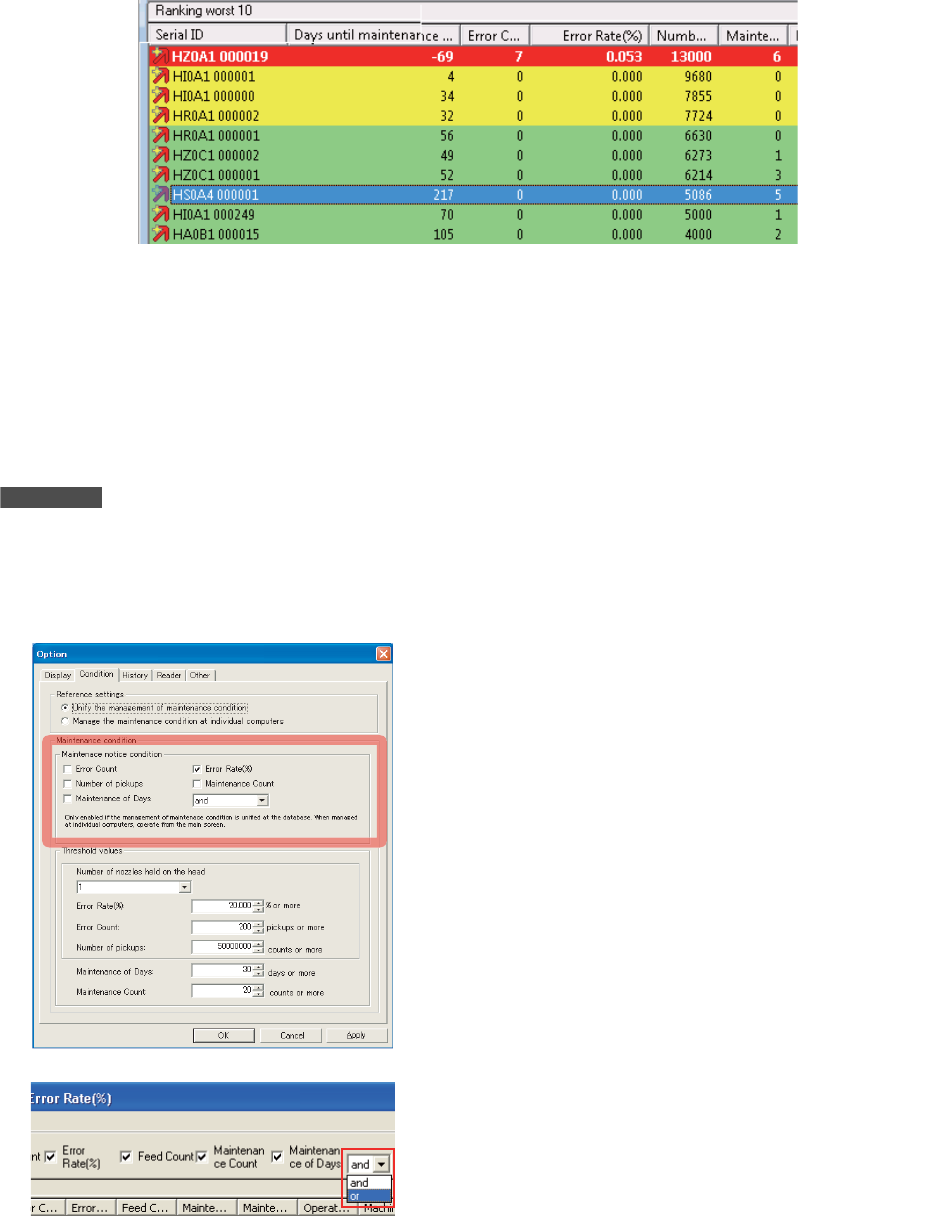 c. [Threshold values]:设定保养条件的阈值。如果超出阈值,就自动变成保养对象 (红色)。