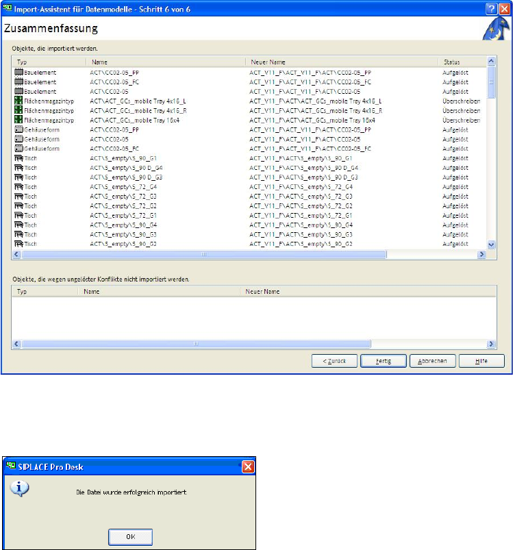 Abbildung 3-25: Fertigstellung beim Import von XML-Dateien für Tische unter SIPLACE Pro