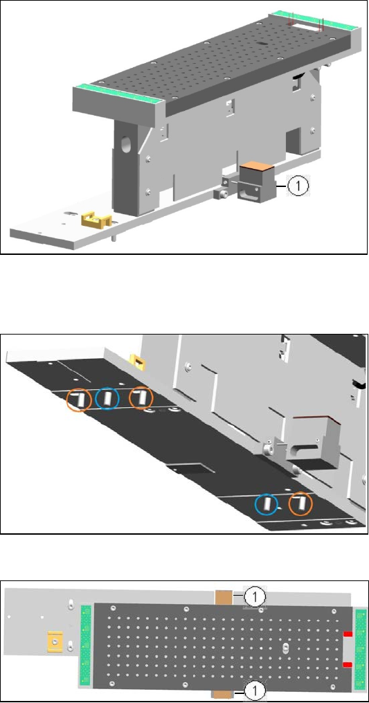 An der Unterseite der Bodenplatte befinden sich 2 Stifte (blaue Kreise) und 3 Schrauben (orange