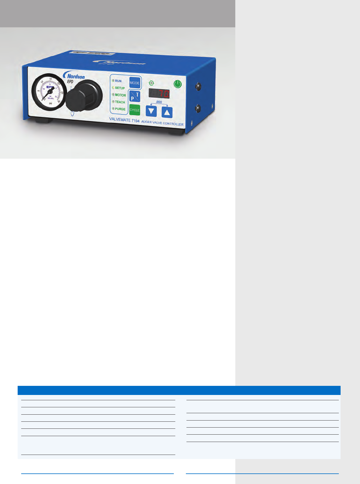 72 www.nordsonefd.com info@nordsonefd.com USA & Canada 800-556-3484 Europe 00800 7001 7001 Asia +86 (21) 3866 9006 ValveMate Controllers ValveMate 7194 Auger Valve Controller Features and Benets • “On the y” deposi…