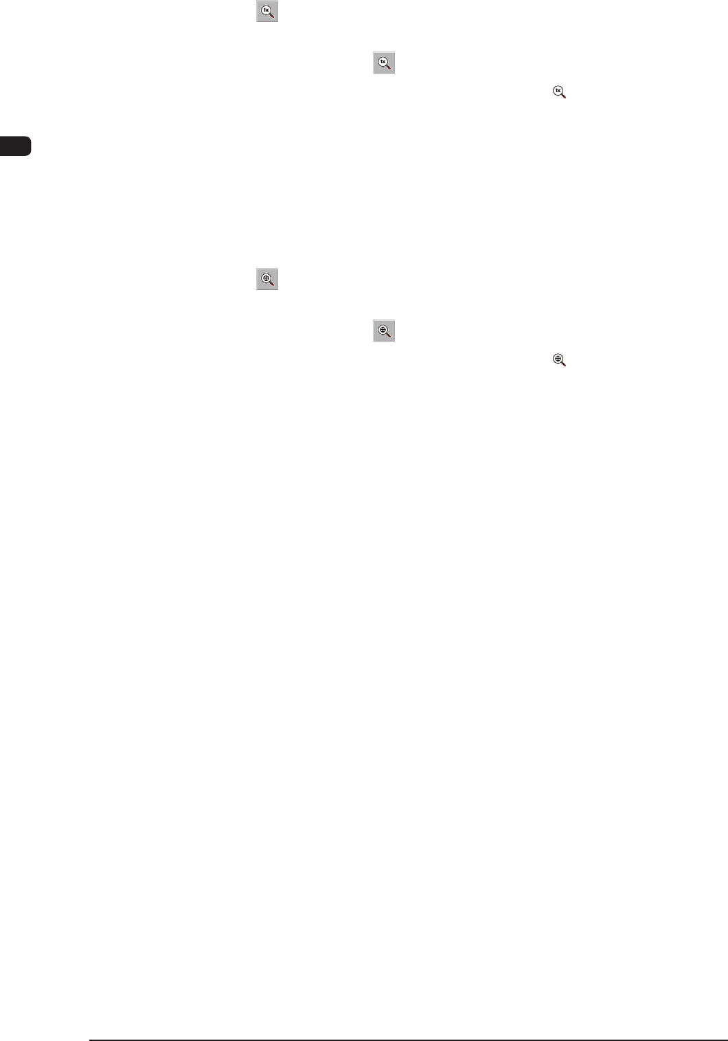 1OM-1601 2-12 2 章 2. 操作画面 1 105-003 [ ] ボタン : 画像原寸表示モード ( 撮込まれた画像を原寸 で表示します。) [ ] ボタンで画像原寸表示モードに移行し たのち ( ポインタの形状が になります。 )、 原寸表示させたい画像をタッチするか、画像 上でマウスの左ボタンをクリックすると、ポ インタの位置を中心に、画像が原寸で表示さ れます。 位置を固定したまま原寸表示したい場合、ポ インタを画像…