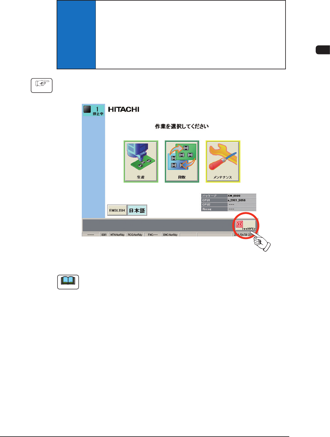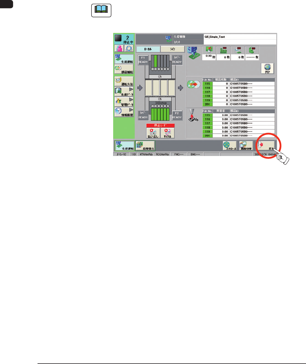 1OM-1601 2-16 2 章 4. 終 了 4. 終 了 4.1 ログアウト 操作画面を終了する場合は、各種メニューバーの [ 戻る ] ボタンを押しま す。 操作画面を終了してトップ画面に戻ります。 ノート “パターンプログラム”編集画面など、各種の編集画面が表示されてい るときは、 [ 戻る ] ボタンを押す前に、各編集画面をそれぞれの操作手 順に従って終了させておいてください。 F1B12 1 105-004