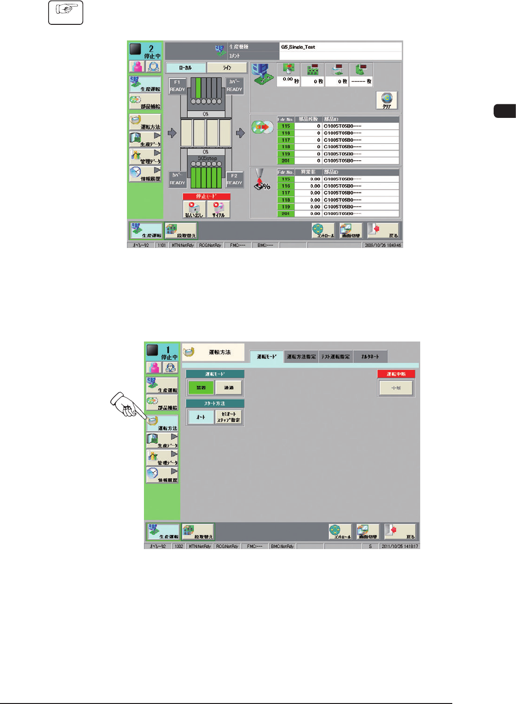(2) “生産運転”画面で、 [ 運転方法 ] ボタンを押す。