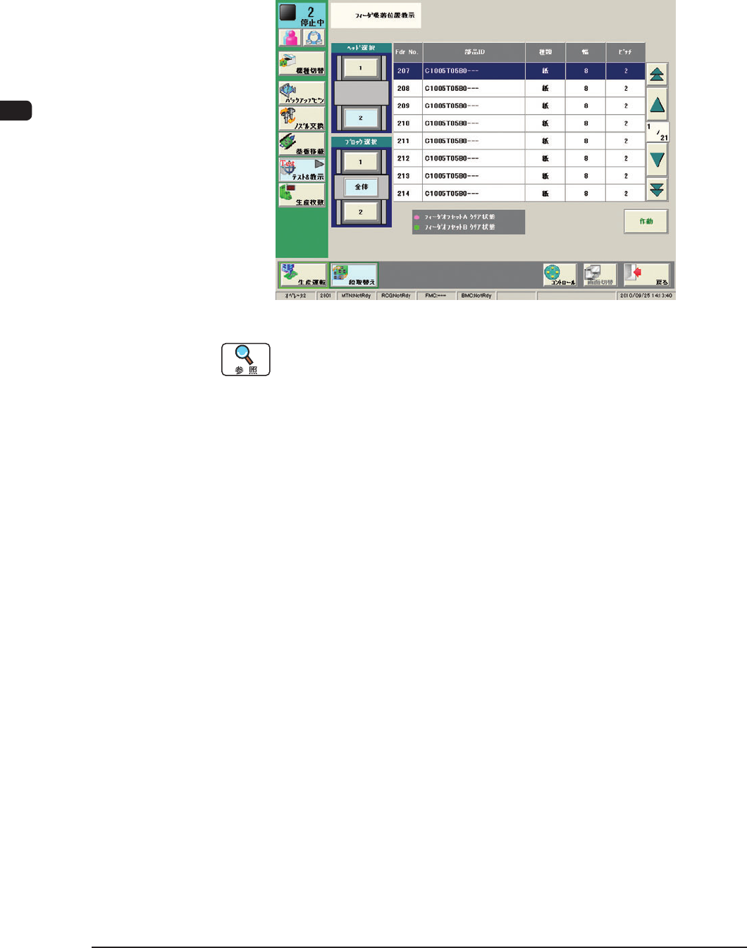 1OM-1601 3-30 3 章 2. 機種切替え 2.3.6 部品吸着位置の確認 通常、少しの吸着位置ずれは自動追従されますので、吸着位置の確認は不 要ですが、吸着位置がデリケートな部品など初回の部品吸着がうまくでき ない場合、 “フィーダ吸着位置教示”を行います。 F1C28 詳細については、 “2 巻 6 章 7.1 吸着位置教示”を参照してください。 1 1 10-004