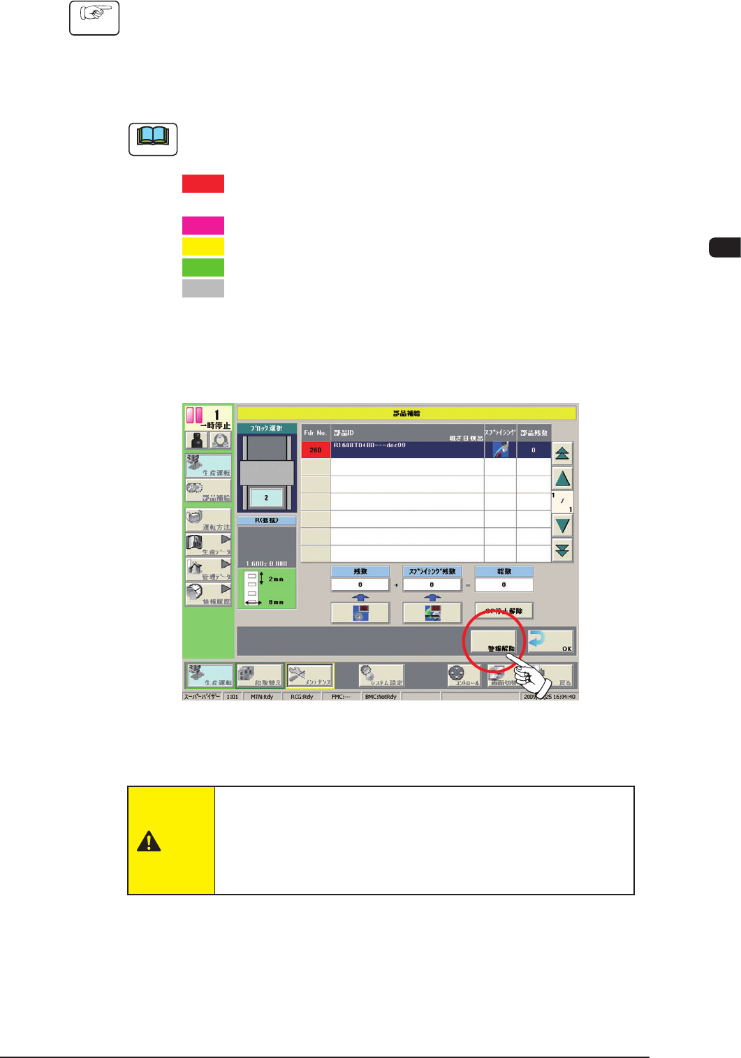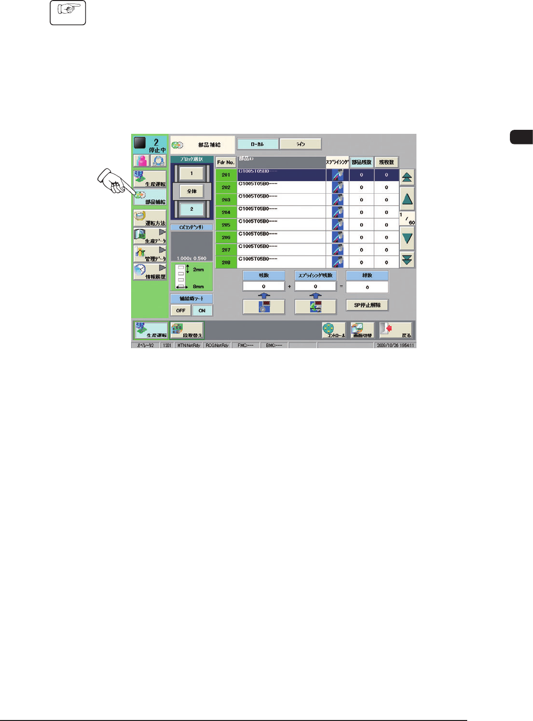 (4) 生産運転メニューで、 [ 部品補給 ] ボタンを押し、“部品補給”画面