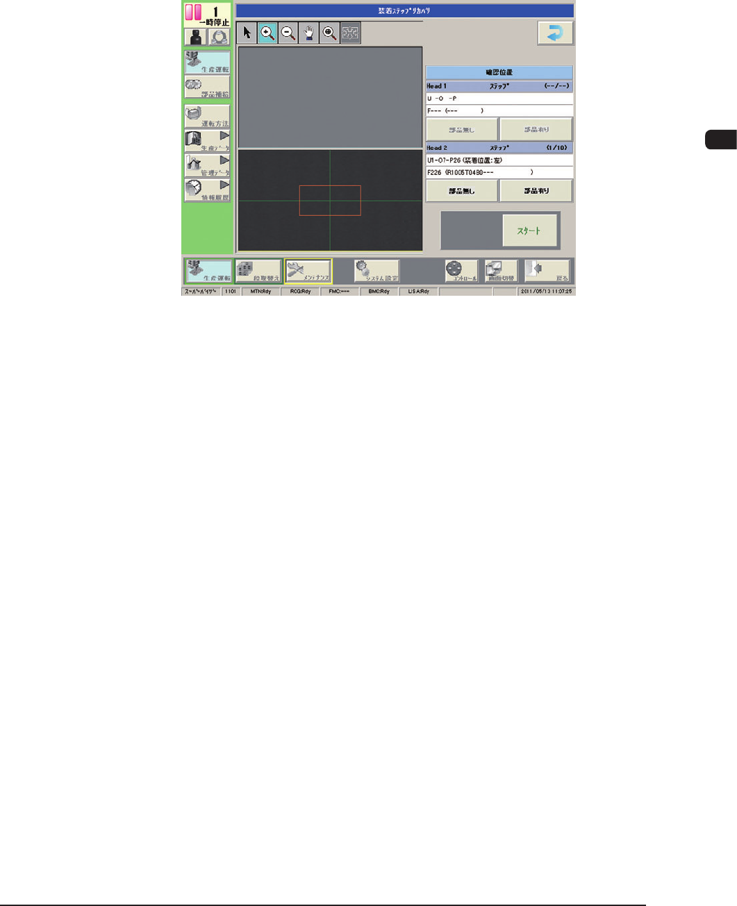 1OM-1601 3-52 3 章 5. 運転の停止、中断と再始動 (2) [ 装着位置移動 ] ボタンを押す。 ( “装着位置”画面が表示されます。 ) F1C46 (3) 基板に部品がある場合は[ 部品有り ]ボタン、基板に部品がない場 合は[ 部品無し ]ボタンを選択する。 ([ 部品有り ]ボタン、 [ 部品無し ]ボタンを押すと、[ 次ステップ ] ボタンが有効になります。 [ 次ステップ ]ボタンを押すと次…