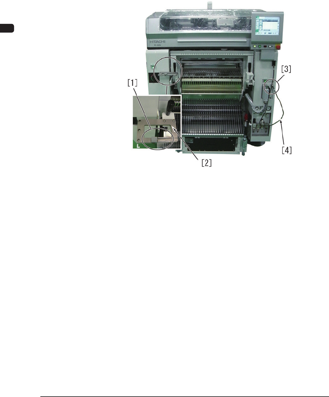 1OM-1601 3-17 3 章 2. 機種切替え (6) 一括交換カートの接続コネクタを装置側の接続コネクタへ接続し、 コネクタ固定レバーをセットする。 注 意 接続コネクタは、確実に接続してください。 接続コネクタが確実に接続されてない状態、または接続をし忘れる と、所定の動作ができなくなります。 (7) 装置のフィーダ準備完了スイッチを押す。 ( フィーダベースの上昇が開始され、装置のフィーダ準備完了スイッ チが点滅 ( 動作中…