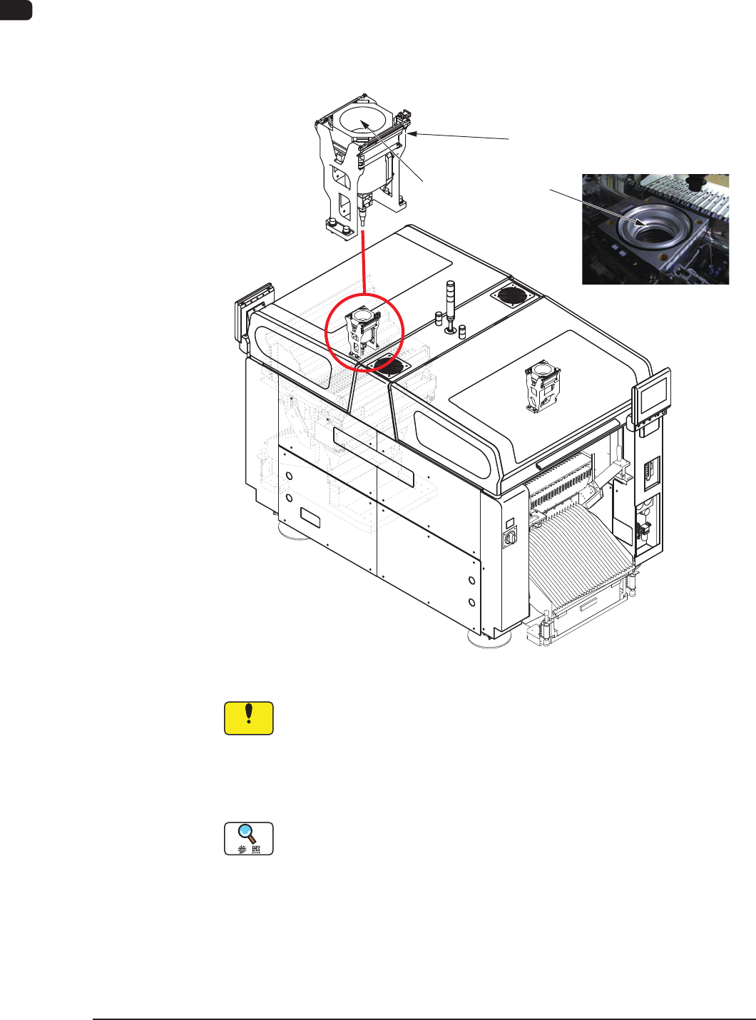 1OM-1601 1-29 1 章 3. 表面実装のための機構 注意 手指の押しつぶしに注意 • 一括交換カートを動かすときは、ハンドルを持って操作 してください。 • 一括交換カートを本体に設置する際、手をカバーにぶつ けないよう注意してください。 足元注意 • 一括交換カートを動かすときは、足にぶつけないように 注意してください。 特に、床に突起や凹凸がある場合や、敷物の段差やたる みなどにひっかかった場合、カートの移動抵抗が急変す…