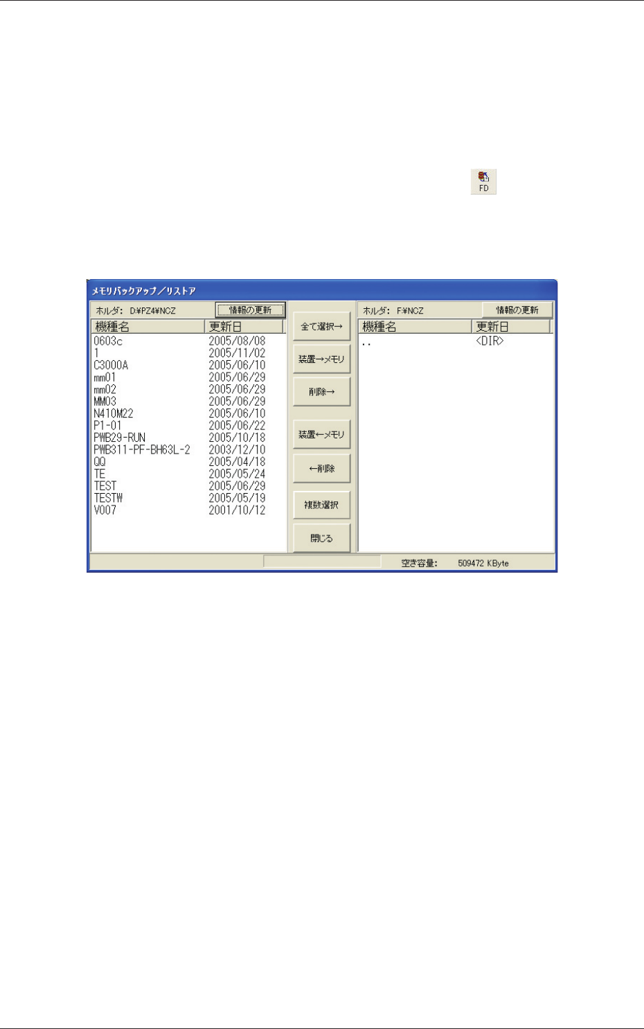 2 - 36 Tg 1299 -ID-PM 0602 - 001 2.1 画面の操作方法 • 画面右側に一覧表示されているパターンプログラムを選択し、 [装 置←メモリ]ボタンを押すと、そのパターンプログラムが USB メ モリから本装置へ戻されます。 • 画面左側に一覧表示されているパターンプログラムを選択し、 [削 除←] ボタンを押すと、 本装置のコンパクトフラッシュカード (CF) に登録されているそのパターンプログラムが削除さ…
