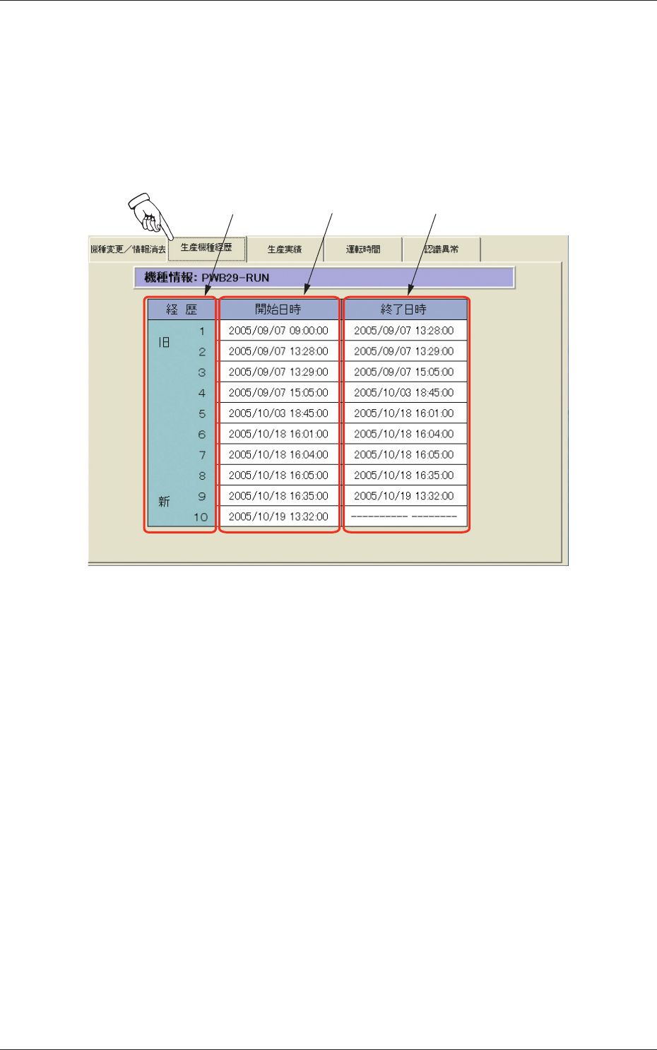 カレント機種の各経歴の運転終了日時が表示されます。